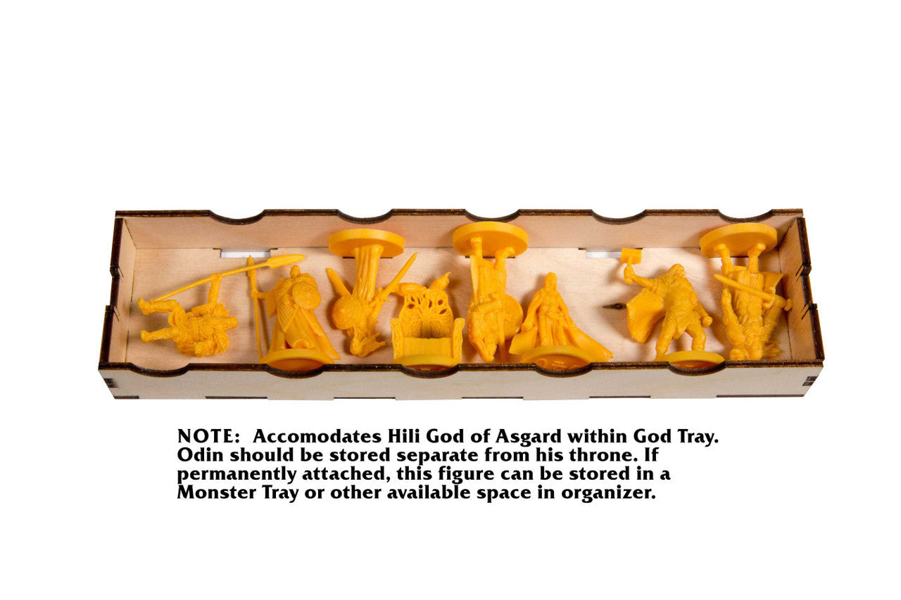 - The Odin figure will have to store loosely in one of the boxes. If he is not glued to the throne, there is nothing in which to clamp him into place. If he is glued to the throne, he will be too large to clamp into the tray and will have to sit loose.