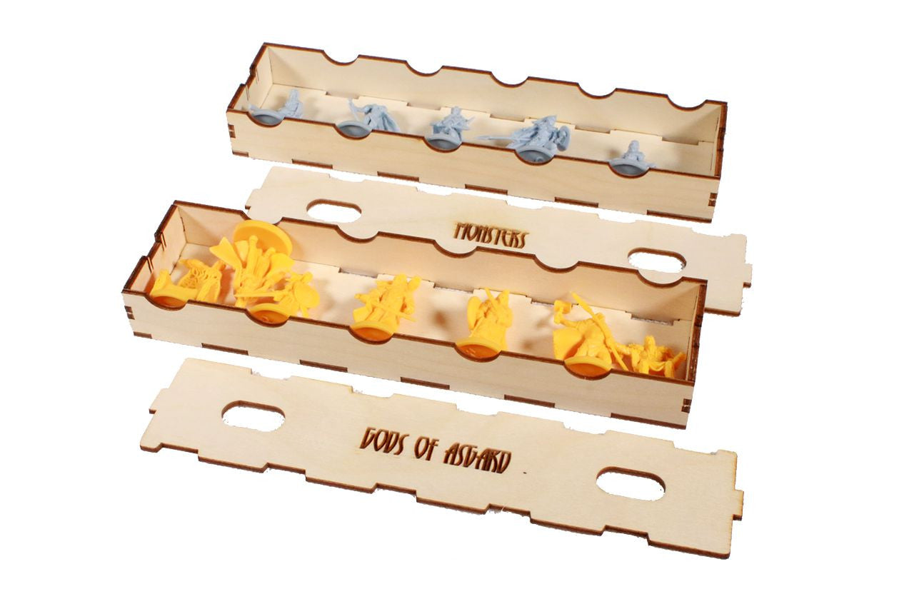 Be prepared for Ragnarök with our Blood Rage Organizer and keep your game from ending up in Valhalla! This Blood Rage Insert not only holds all of the game contents, expansions and Kickstarter exclusives, but does it in a way that painted miniatures are protected during storage and travel. Each miniature is suspended by it's base so it does not come in contact with other miniatures. Each clan has its own player tray engraved with the clan logo and name. Separate trays hold the monsters and gods miniatures. In addition to protecting your game, our organizer will tremendously cut down on setup and teardown times leaving you more time to vanquish your foes!