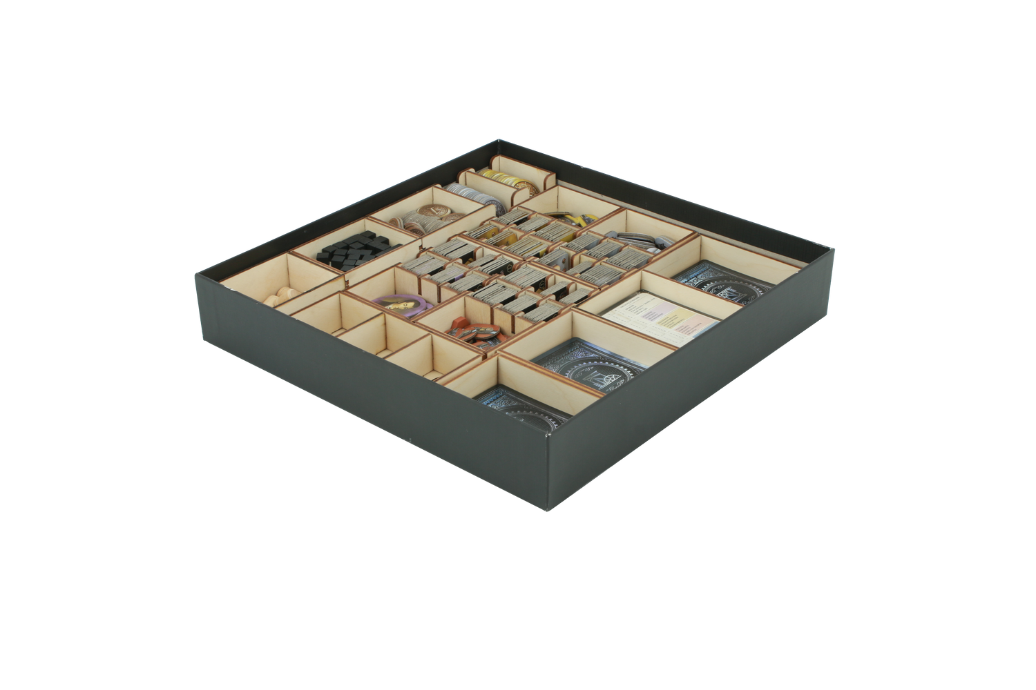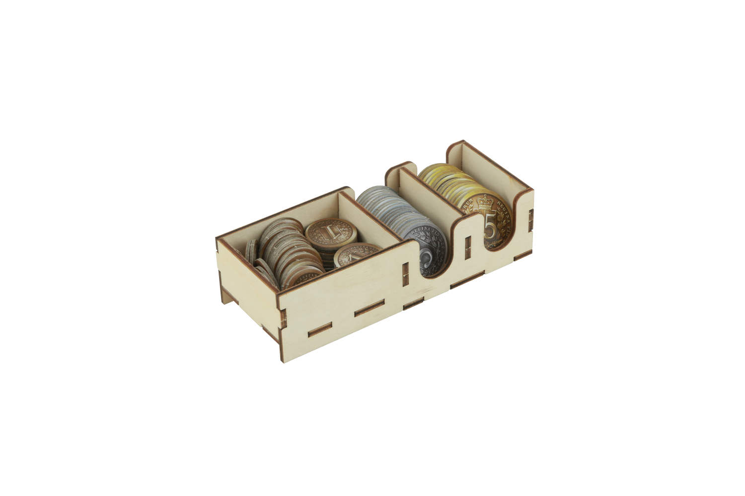 Our organizer features player trays containing all the tokens a player will need during the game in one place and card deck holders based on how many players are at the table. We design all of our removable trays to be used on the table during play, keeping all of your tokens and cards tidy and easy to pass around the table.