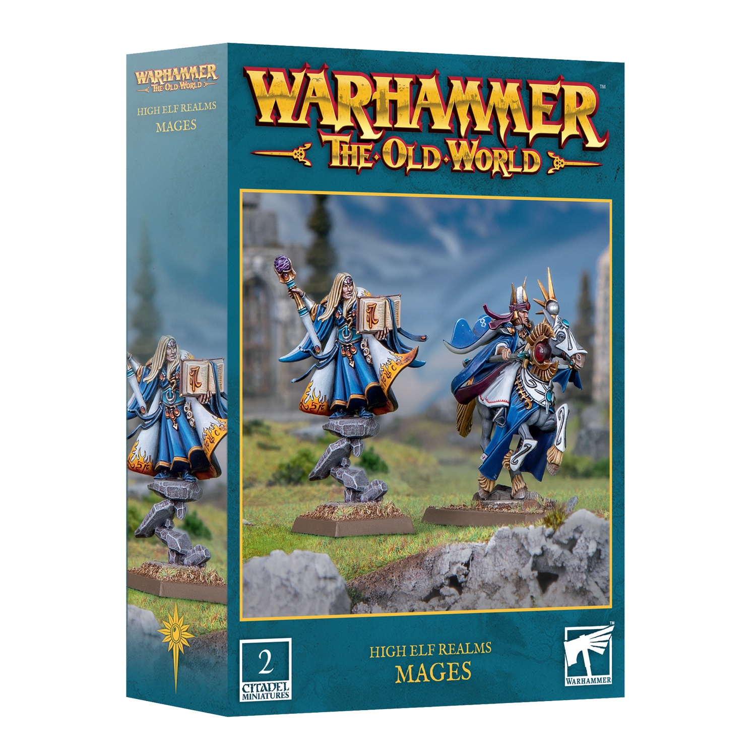 This multipart plastic kit builds two High Elf Mages – one on foot and one atop a barded Elven steed – powerful Wizards for High Elf Realms armies in games of Warhammer: The Old World. These masters of the arcane arts are able to unleash the powers of the Winds of Magic upon your foes.
