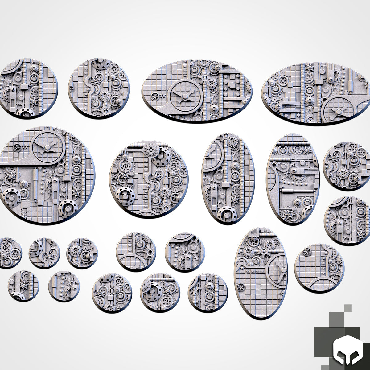 Created by Txarli Factory and flawlessly printed by Printology Labs, the 'Steampunk' base set showcases the refined beauty of a pristine, steam-powered world. Perfectly interlocking cogs, polished brass machinery, and gleaming pipework create a scene of meticulous craftsmanship and technological marvel. Ideal for steampunk adventures or alternate-history settings, these bases exude an atmosphere of sophistication and mechanical ingenuity.