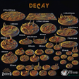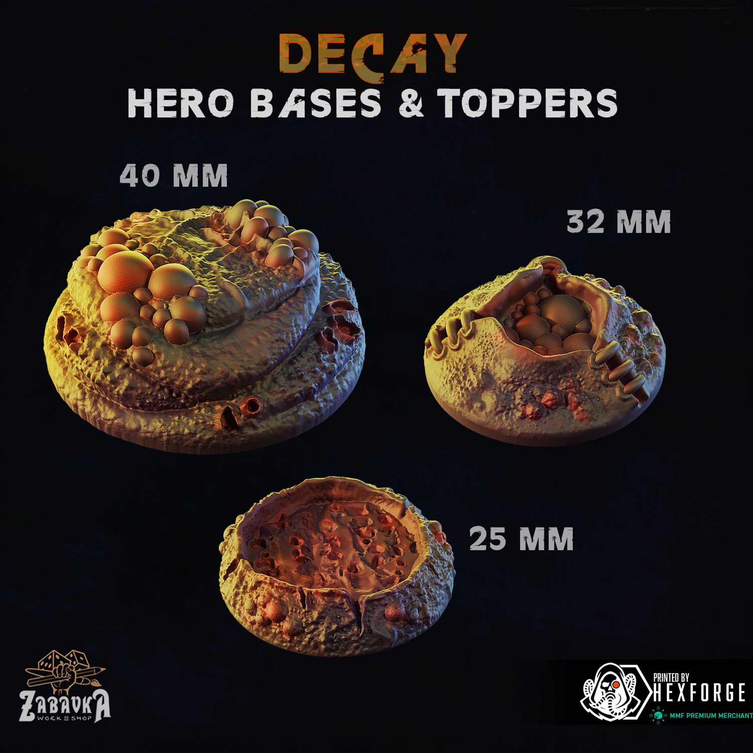 Designed by Zabavka Workshop and expertly printed by Printology Labs, the 'Decay' base set plunges your miniatures into a twisted, diseased landscape. Bubbling pools of corruption, warped terrain, and grotesque fungal growths evoke a realm shaped by daemonic plague. Perfect for grimdark or horror settings, these bases bring the unsettling, pestilent touch of chaos to your tabletop.