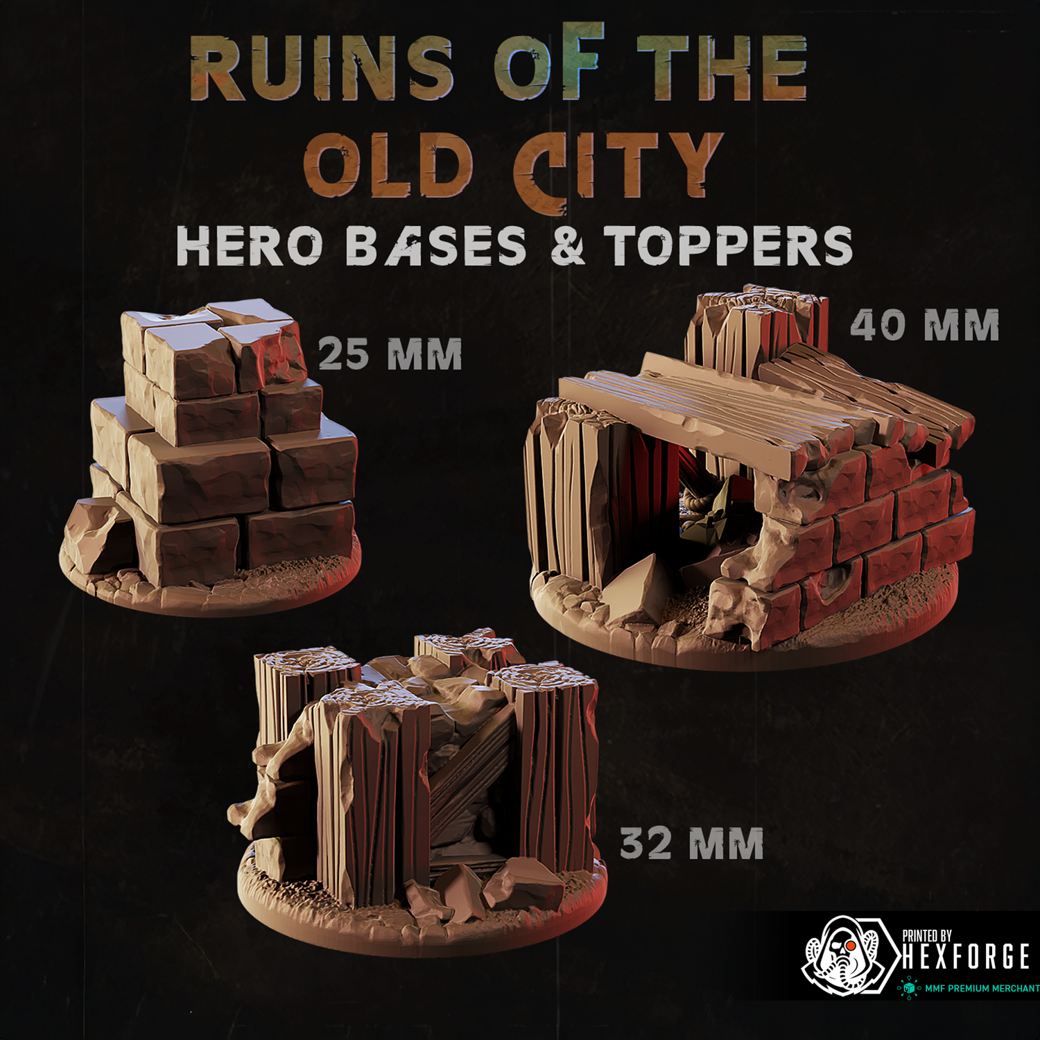 Crafted by Zabavka Workshop and expertly printed by Printology Labs, the 'Ruins of the Old City' base set brings your miniatures into the remains of a once-bustling medieval town. Weathered cobblestones, splintered wooden beams, and collapsed stone walls scatter the landscape, telling stories of fire, siege, and time’s slow decay. Perfect for fantasy settings, these bases capture the grounded realism of a crumbling world—where adventurers tread through ruins echoing with the ghosts of simpler days.