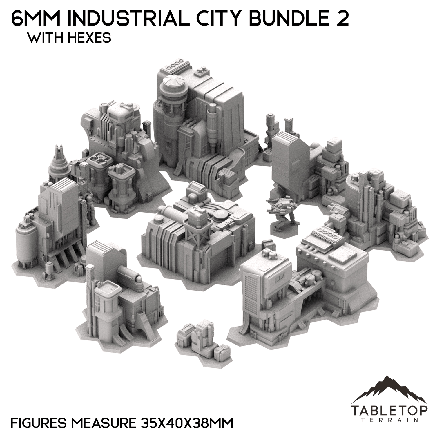 A set of 10 6mm Sci-Fi Industrial City buildings. You can choose to have them come with or without hexes. It would work great in any 6mm mech scale tabletop wargame.
