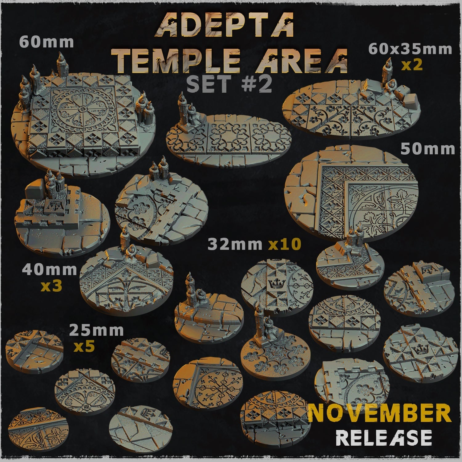 Crafted by Zabavka Workshop and expertly printed by Printology Labs, the 'Adepta Temple Area' base set immerses your miniatures in a sacred sanctum dedicated to God Kings and the art of battle. Ornate stone tiles, engraved holy symbols, and architectural elements exude an air of divine power and martial purpose. Perfect for grimdark or high-fantasy settings, these bases transform your tabletop into a battleground of faith and valor.