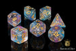 This set was created to resemble the natural element Violet Amethyst. The dice are purple and light blue translucent swirling containing trace amounts of reflective silver glitter and inlaid with a metallic gold; premium hand-mixed resin 16mm dice set containing D4, D6, D8, D10, D10, D12, and D20.