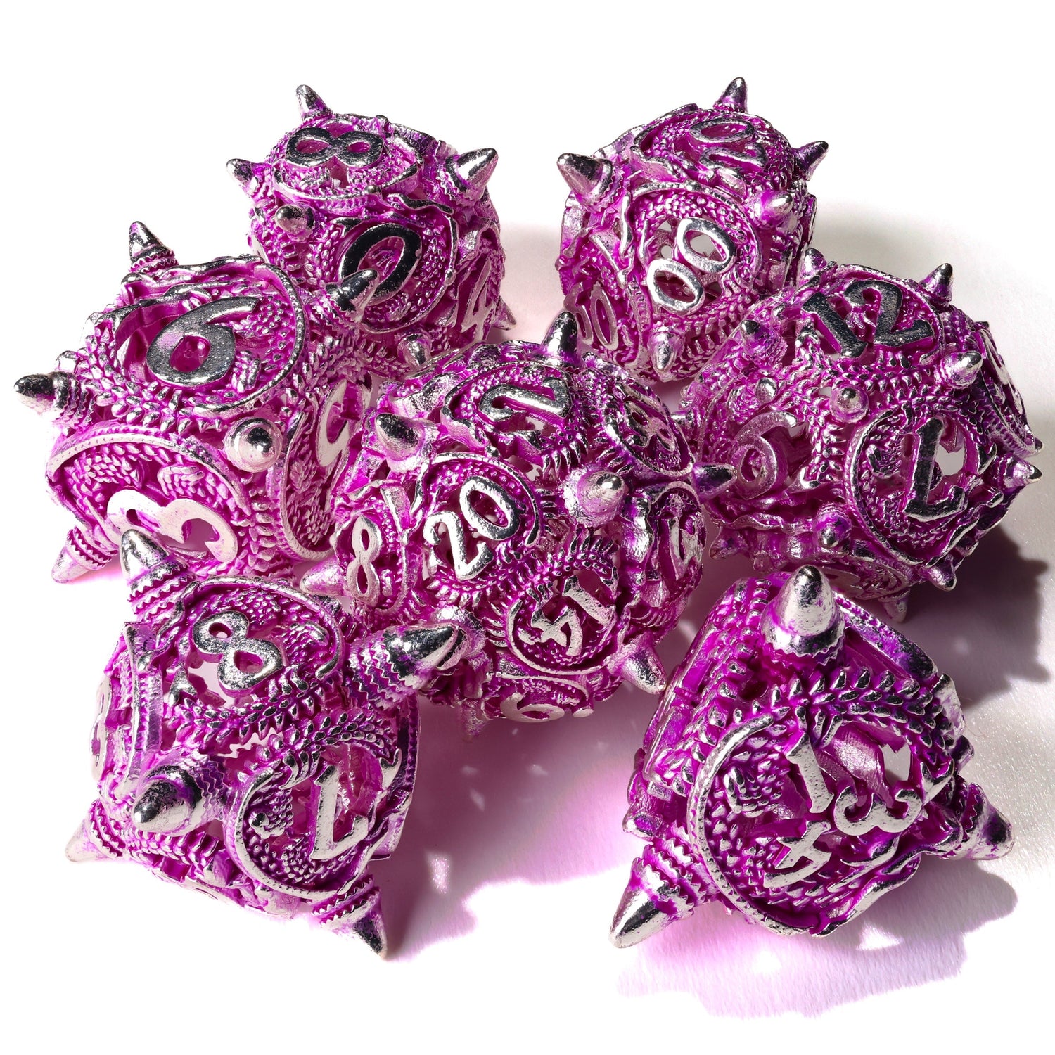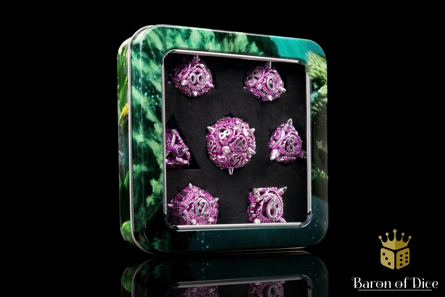 This set is made from ancient dragon steel, oiled to a shimmering purple rainbow. Cut from Earth's veins, these metal dice are ready to blow your mind! Featuring miniature dragons embedded across each die, in iridescent steel, these are ready to roll from the skies; premium metal 20mm dice set containing D4, D6, D8, D10, D10, D12, and D20.