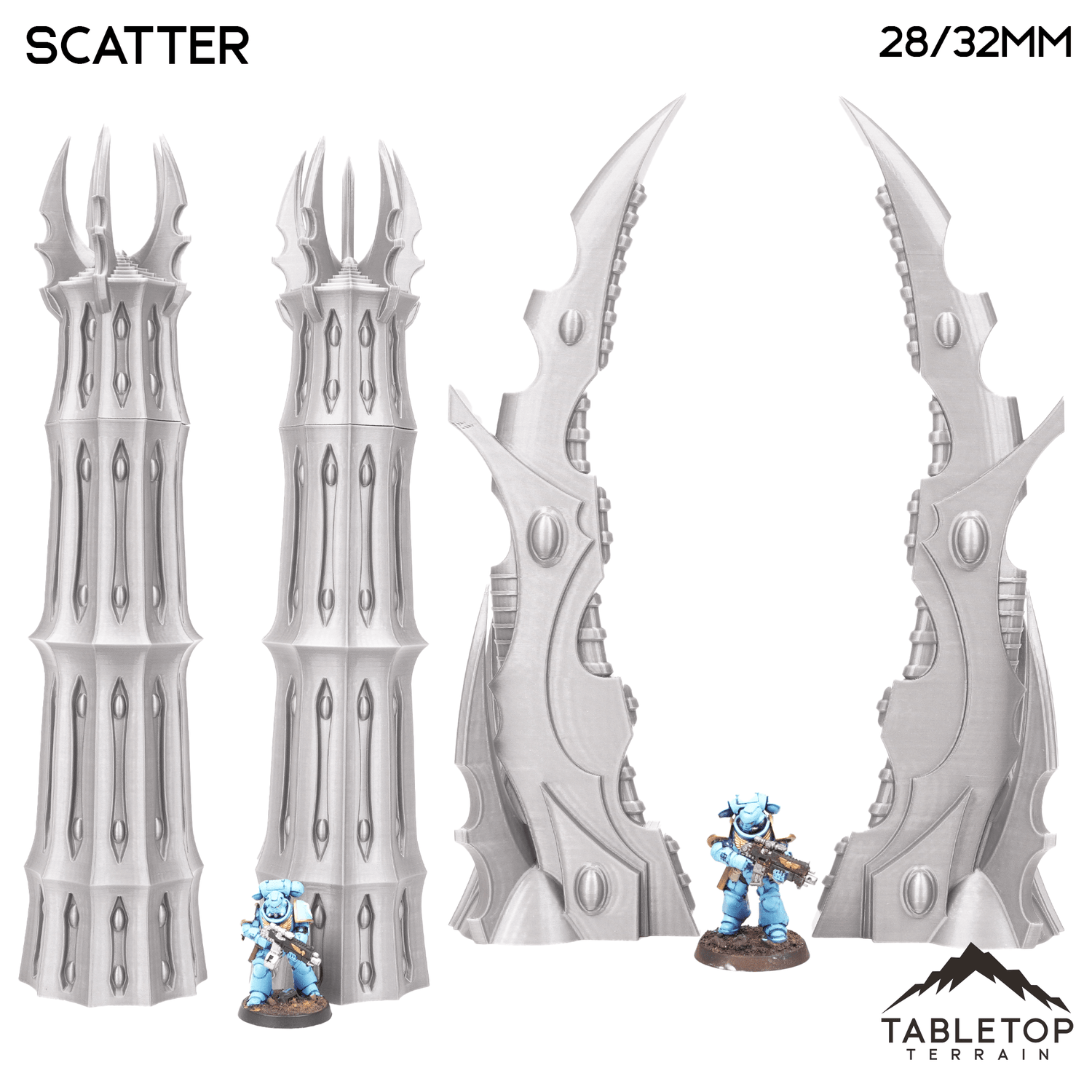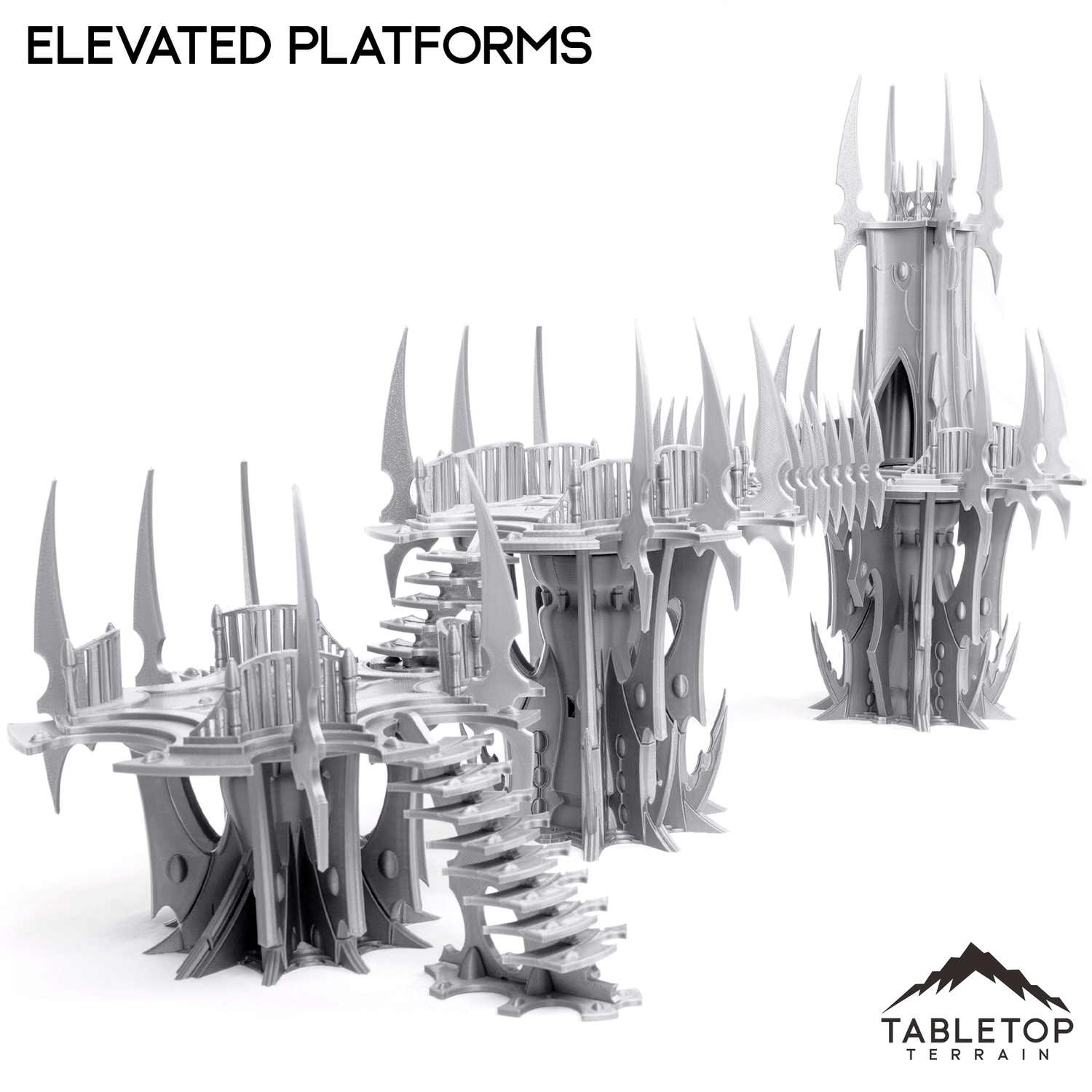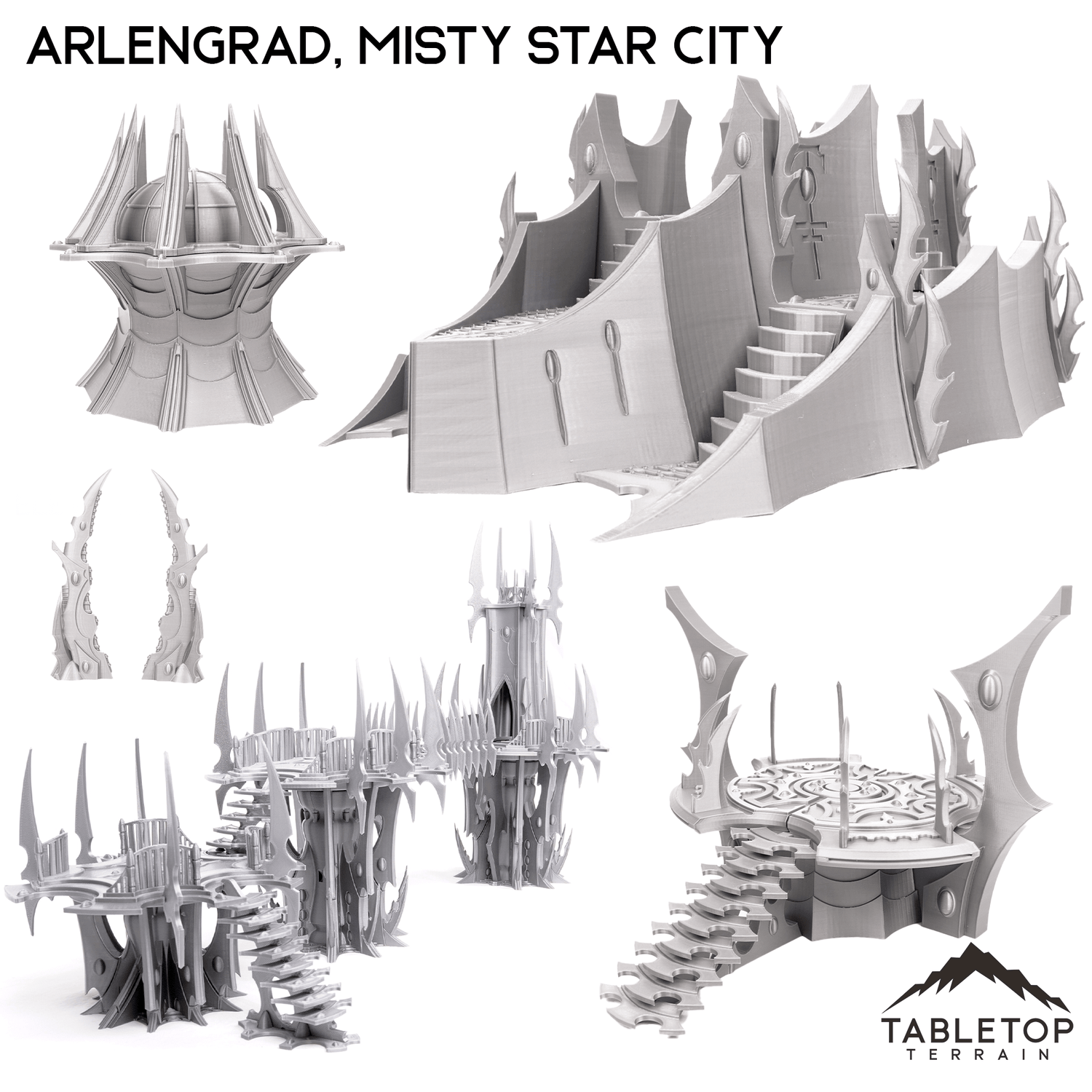 Arlengrad, Misty Star City is a sci-fi Space Elves themed table set, perfect for science fiction or fantasy wargaming. Compatible with Space Elves models, this set would work great for thematic Space Elves terrain.