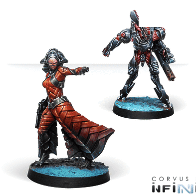 This blister includes two miniatures: Bit, a Hacker equipped with a Killer Hacker Device and a large arsenal of Repeaters to extend her effective range and KISS!, a remote equipped with an Adhesive Launcher capable of stopping any enemy.