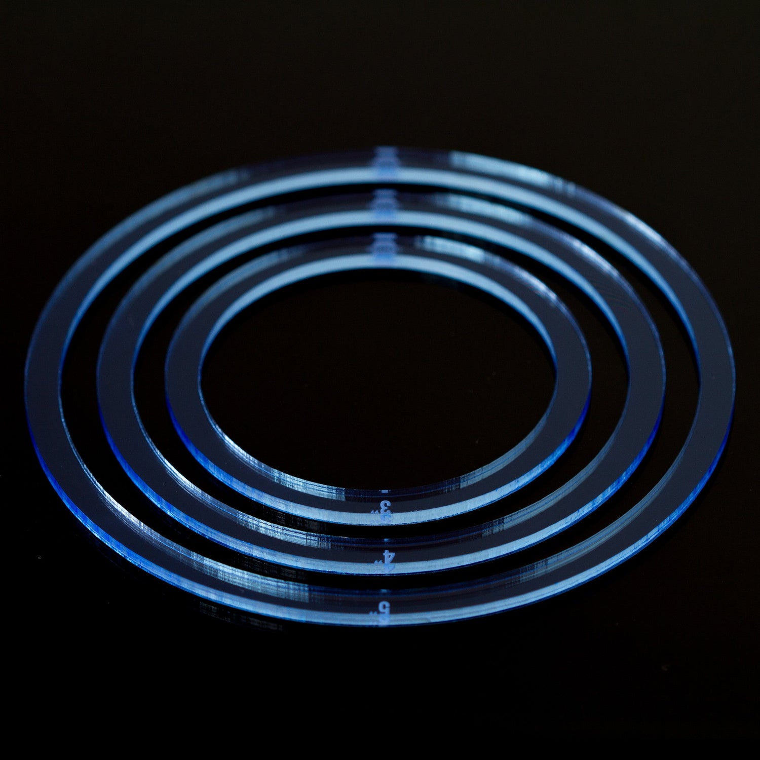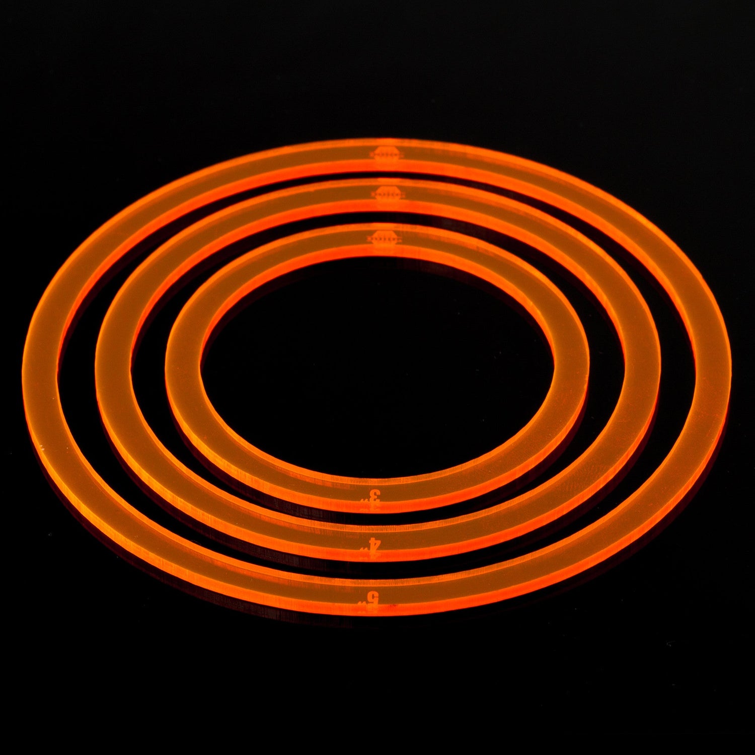 Cut from 3mm acrylic in a variety of fluorescent colors.