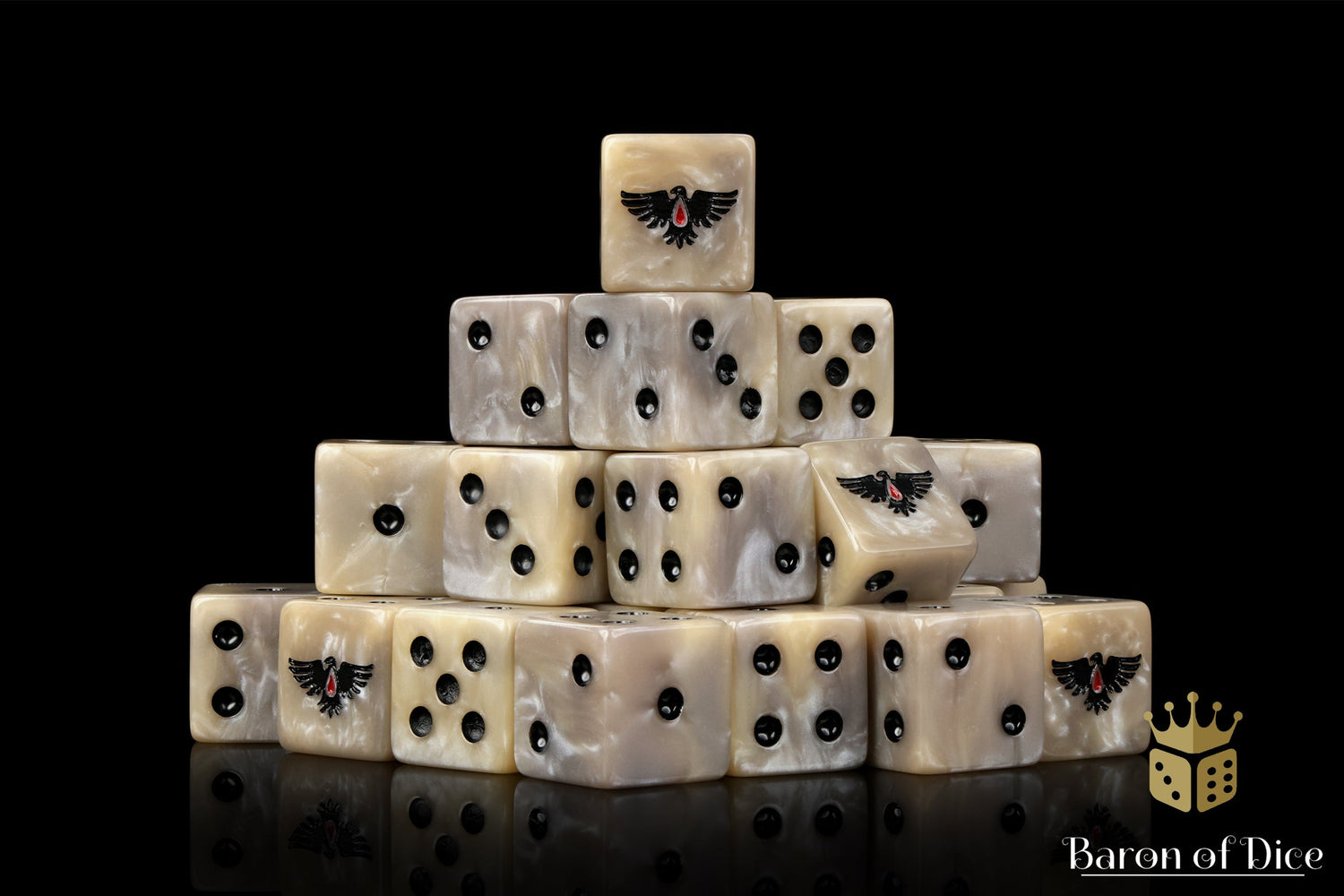 These contain a mix of freshly cracked bone swirled with a worn cream and inlaid with a two-toned blood red and pure black; resin 16mm dice. The symbols are on the 6 side. These dice have an option of round or square corner, choose wisely! Our premium dice come in unique reusable tins.