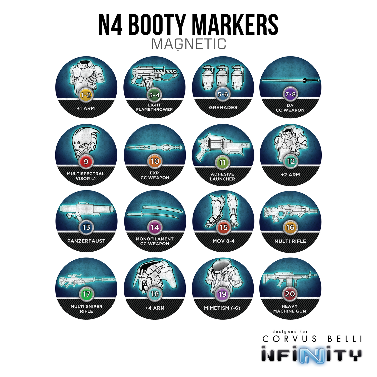 25mm full-color acrylic or magnetic markers to mark your models with what they have acquired from the Booty Special Skill in Infinity the Game, so you can easily keep track of which model rolled what result.