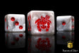These contain a mix of chivalrous whites swirled with a smokey grey and inlaid in the purest red; resin 16mm dice. The symbols are on the 6 side. These come in round corner or square corner; choose wisely! Our premium dice now come in a unique reusable tin.