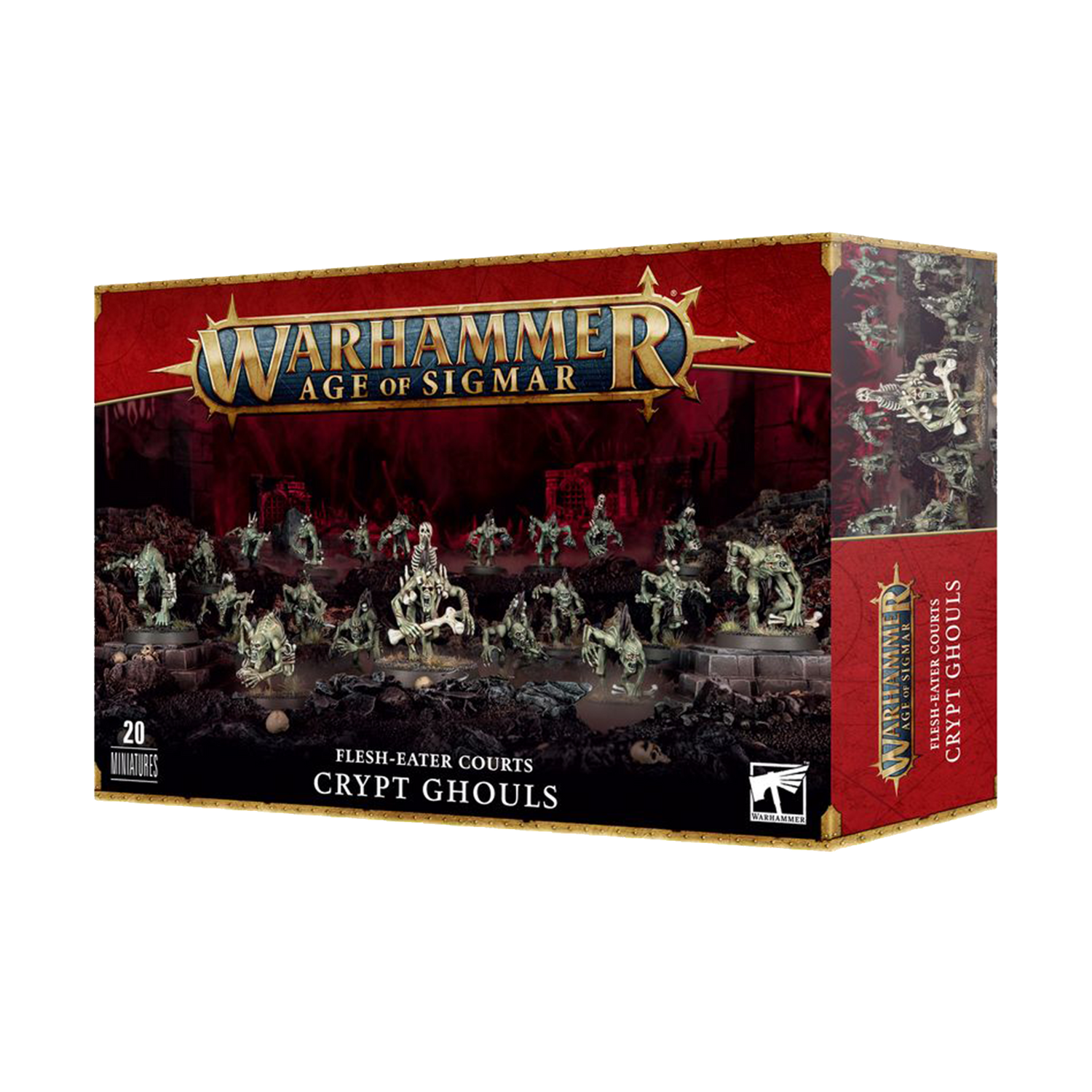 This multipart plastic kit builds 10 Cryptguard, devoted ghoul retainers for the nobility of the Flesh-eater Courts. The Cryptguard carry a variety of cursed weapons into battle – you can outfit each ghoul with a chipped and battered sword, or a long-handled and well-worn halberd. The kit also provides components to build a drummer musician, a standard bearer waving a flag of flayed skin, and a Crypt Captain champion with uniquely grisly headgear.