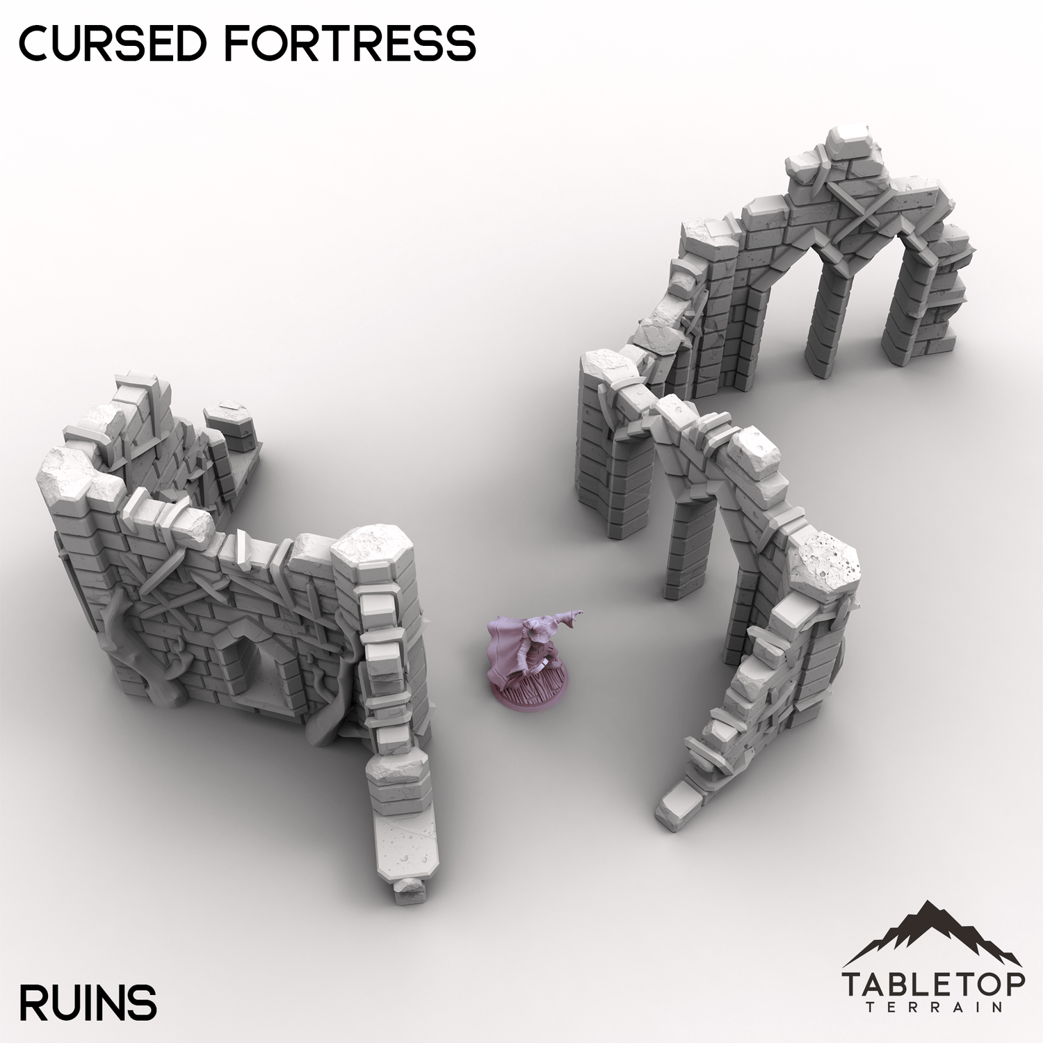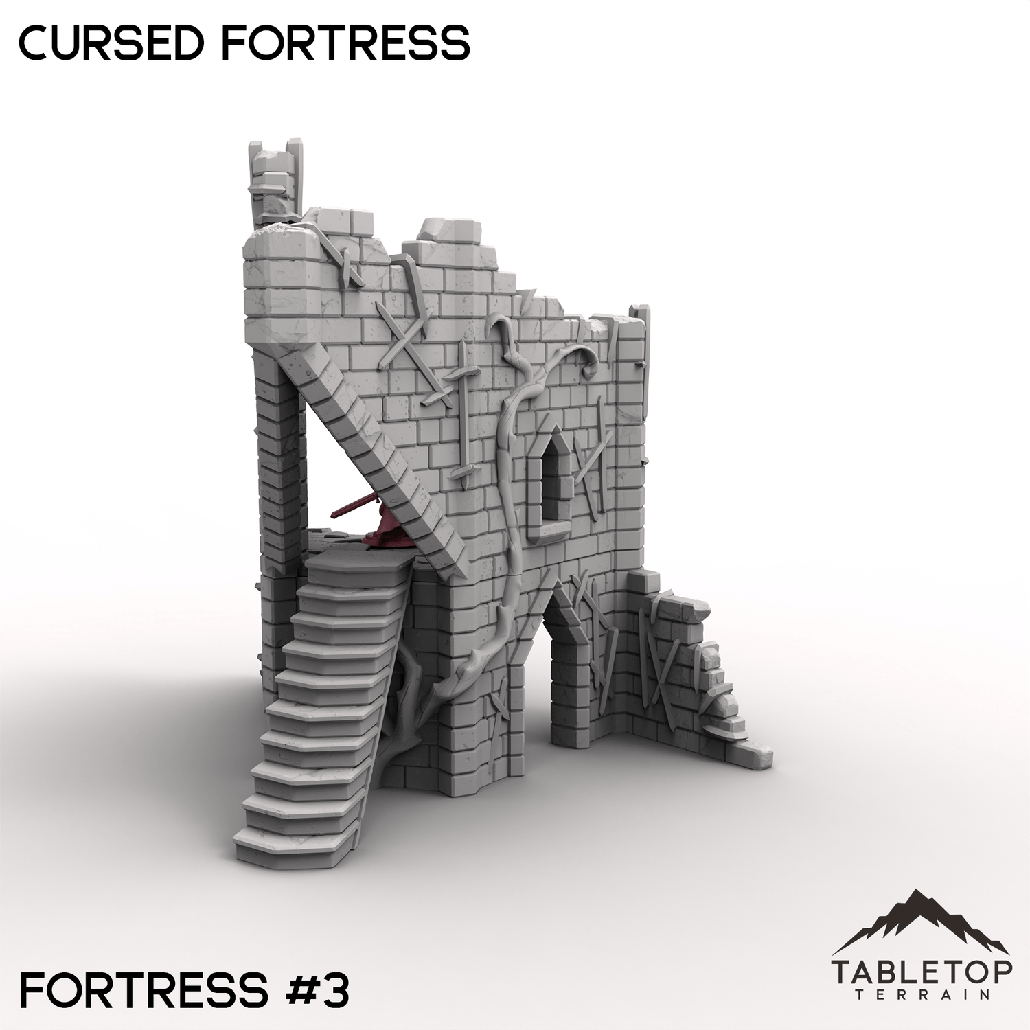 The Cursed Fortress consists of jagged ruins and towering remnants of a long-fallen stronghold. Its crumbling stone walls and ominous archways, exudes an air of forgotten power and lingering dread. Twisting staircases lead to precarious walkways, while shattered columns and broken statues hint at the glory that once was. Perfect for eerie explorations, or battles against unseen horrors.