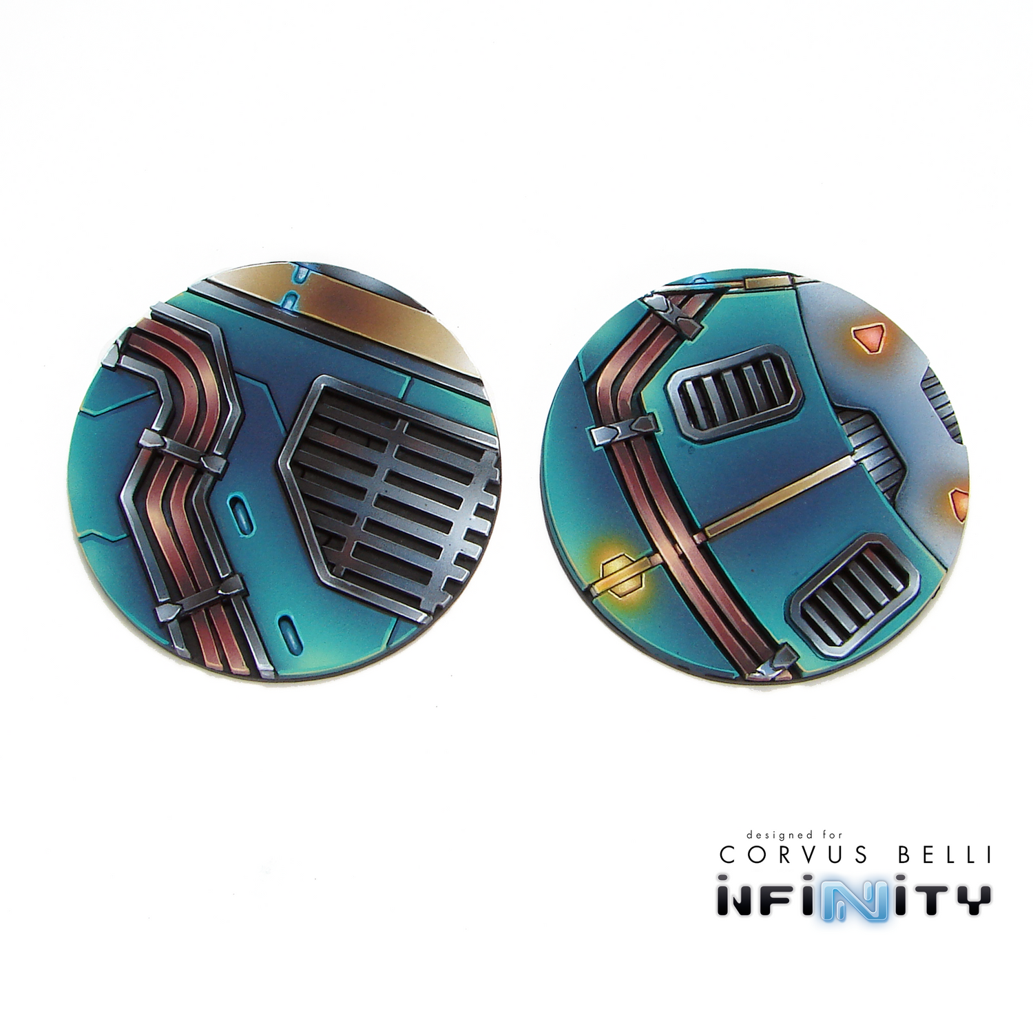The bases can be mounted on standard Corvus Belli bases that you can magnetize for transport using our Rare Earth Magnets. They are lined up to work perfectly with our Infinity Status Discs.