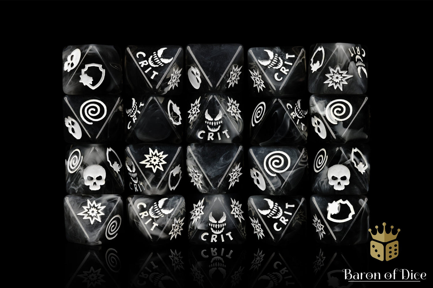 The world has enough superheros. These contain a base of black lucent, swirled with otherworldly white swirls creating a white and black mass creeping across the die faces and inlaid with a crisp white. The symbols are all unique with a focus on a singular critical die face differentiating the designs. Each set comes with x10 count, D8 dice encased inside an exclusive metal tin.