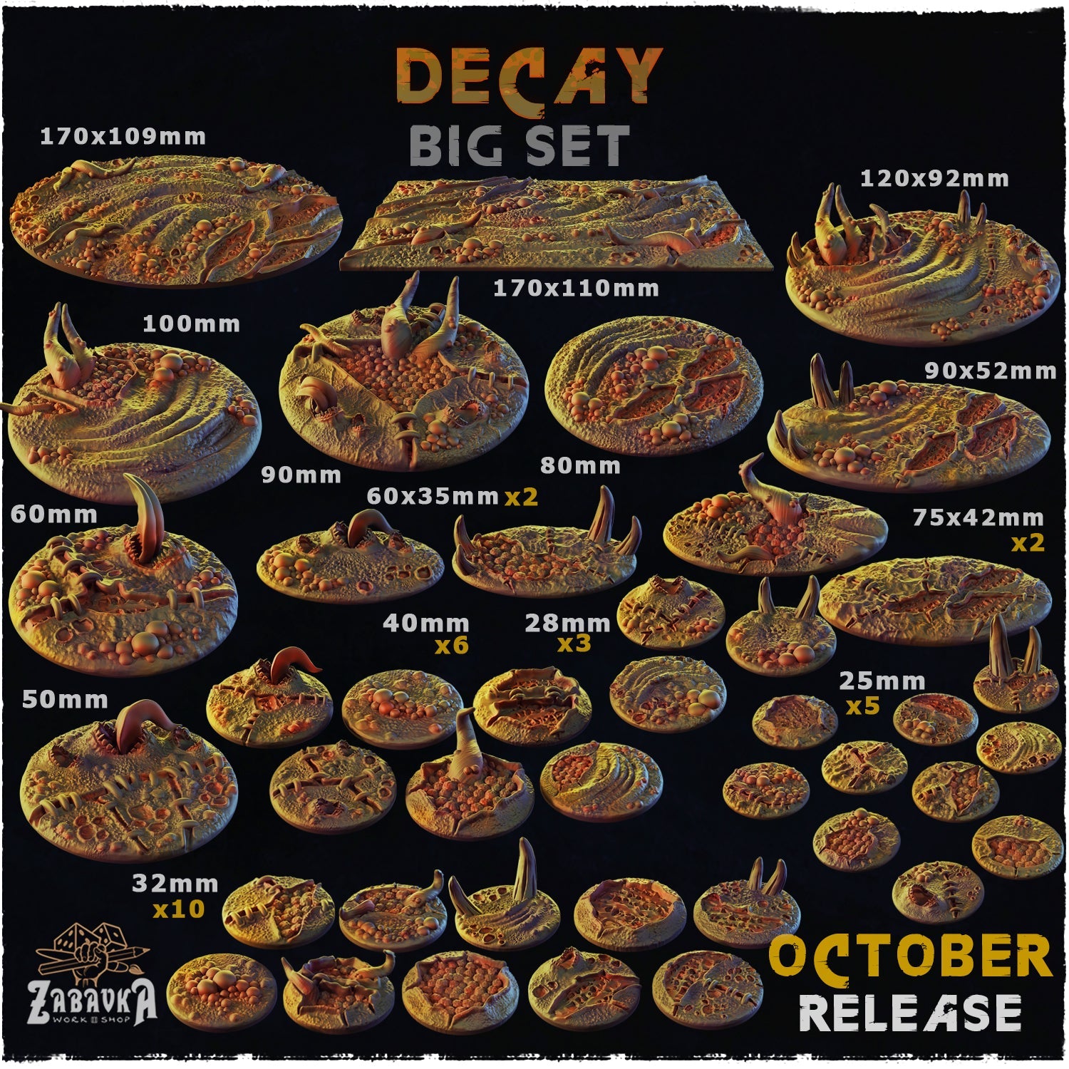 Designed by Zabavka Workshop and expertly printed by Printology Labs, the 'Decay' base set plunges your miniatures into a twisted, diseased landscape. Bubbling pools of corruption, warped terrain, and grotesque fungal growths evoke a realm shaped by daemonic plague. Perfect for grimdark or horror settings, these bases bring the unsettling, pestilent touch of chaos to your tabletop.