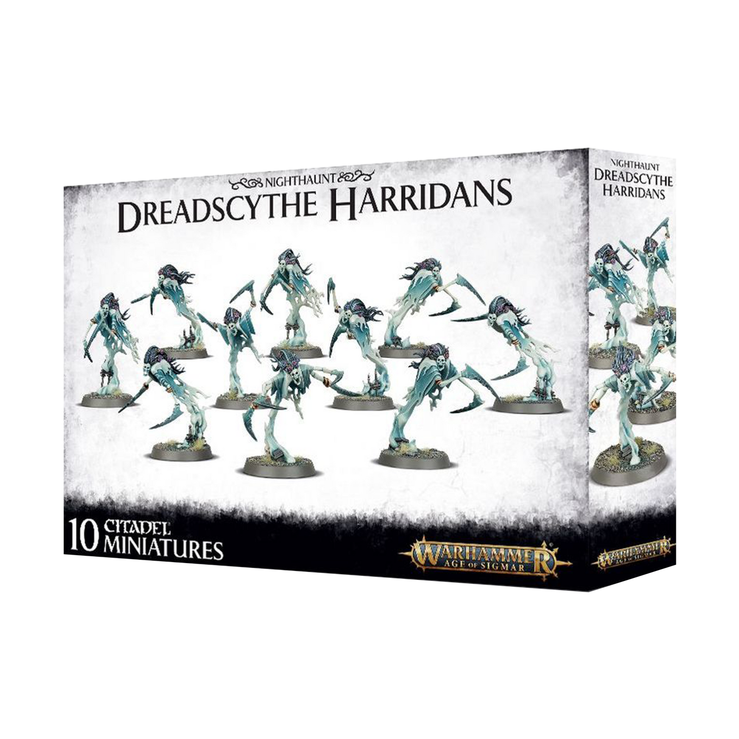 This multi-part plastic kit contains the components necessary to assemble 10 Dreadscythe Harridans. Particularly horrible and tragic even for Nighthaunt, They are tortured and twisted forms, rising as ethereal spirits whose emaciated arms peek out from beneath their cowls. These arms are their weapons – from the wrist onward, each becomes a curved, serrated scythe blade, growing out at a right-angle for maximum reaping efficiency. Each features a morbid, grinning skull for a head, above which long hair billows behind them, with beautiful roses ironically entwined. 4 of these models feature an alternate right arm, allowing for some uniqueness when assembling, and you have the option to build 2 Slasher Crones – these are the unit leaders of the Dreadscythe Harridans, and can be distinguished easily as they feature 4 arms instead of 2. They each feature graveyard detritus – pieces of rock, wrought iron – by which they attach to their bases.