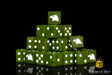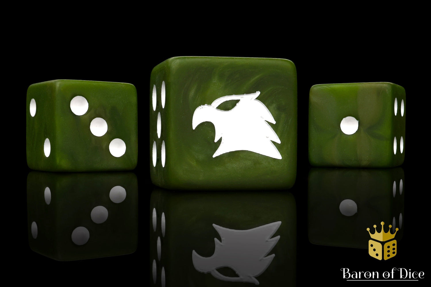These are a dull darkened military green and inlaid with pure white; resin 16mm dice. The symbols are on the 6 side. These dice have an option of round or square corner, choose wisely! Our premium dice now come in a unique reusable tin.