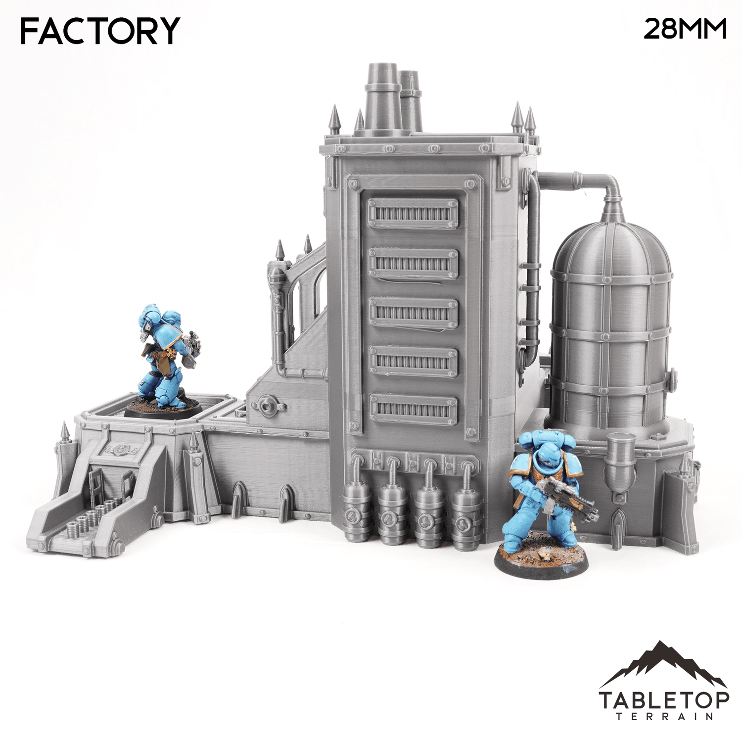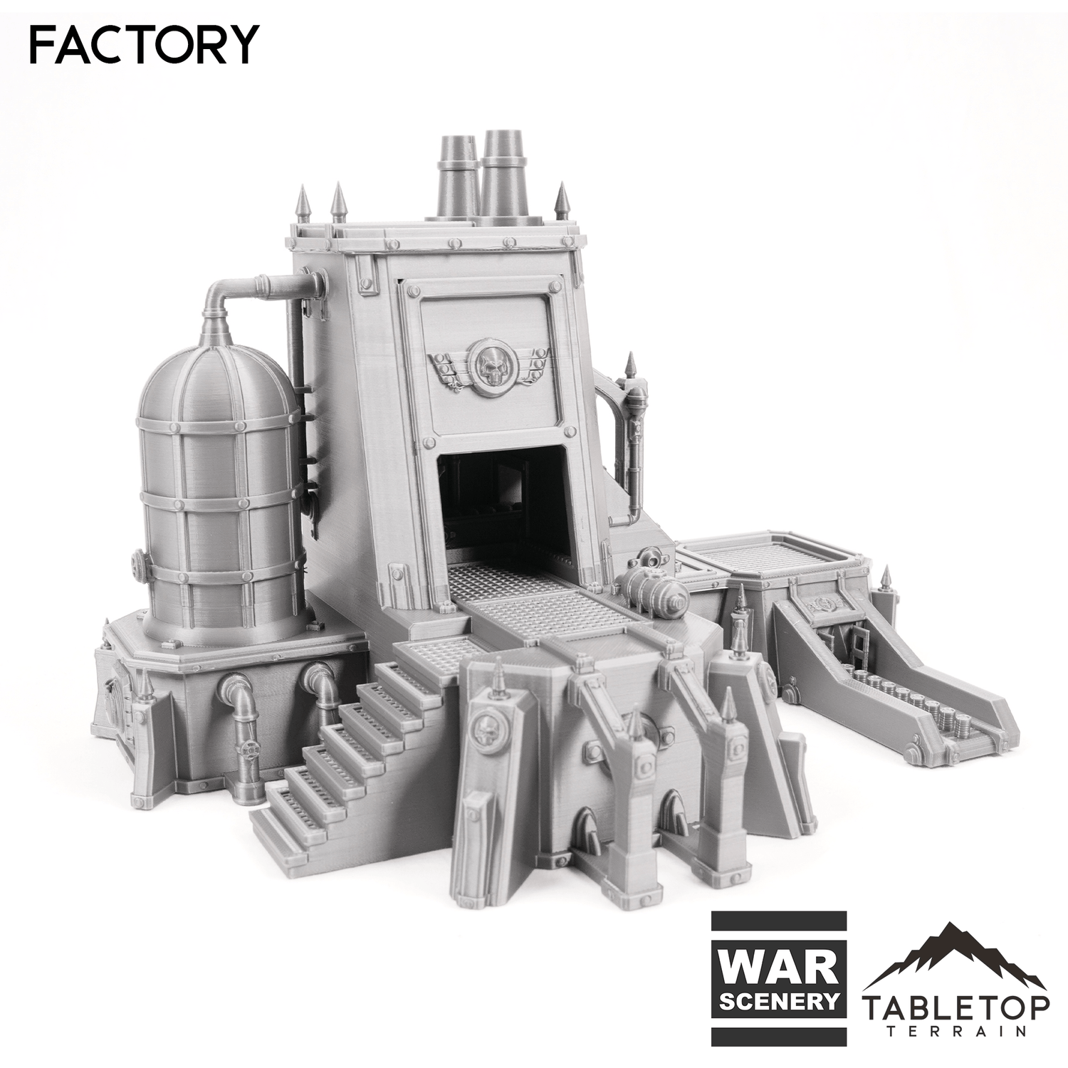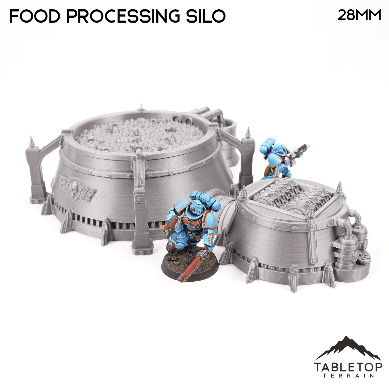 The Factory and Food Processing Silos are 2 different sets, designed to be paired together. The factory is a singular building, designed to look menacing and utilitarian. The silos are a grisly pair of containers for the processed food to be stored and prepared in. The Factory and Food Processing Silo sets are designed for sci-fi wargames, but can be used with any system.