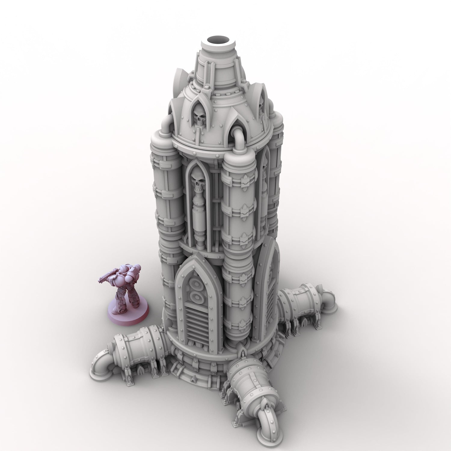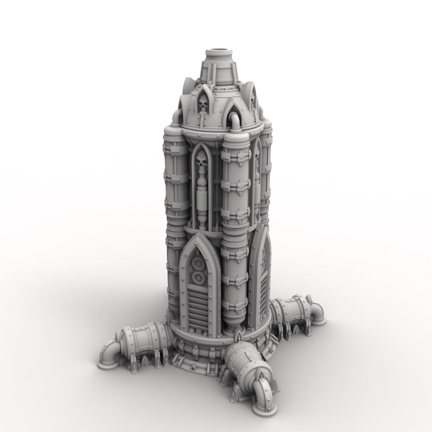 The Gas Flux Compressor hums with volatile energy, its coils and conduits channeling unstable gases into controlled streams of raw power. Surrounded by reinforced shielding and vent stacks, this industrial structure crackles with energy.