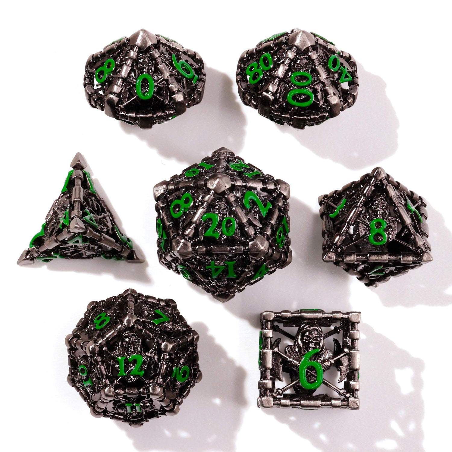 This set is made from wrought steel, honed to a glow. Cut from the Earth's veins, these metal dice are ready to blow your mind! Featuring a grim reaper design across each die, in shining steel, these are inlaid with dark green energy; premium metal 20mm dice set containing D4, D6, D8, D10, D10, D12, and D20.