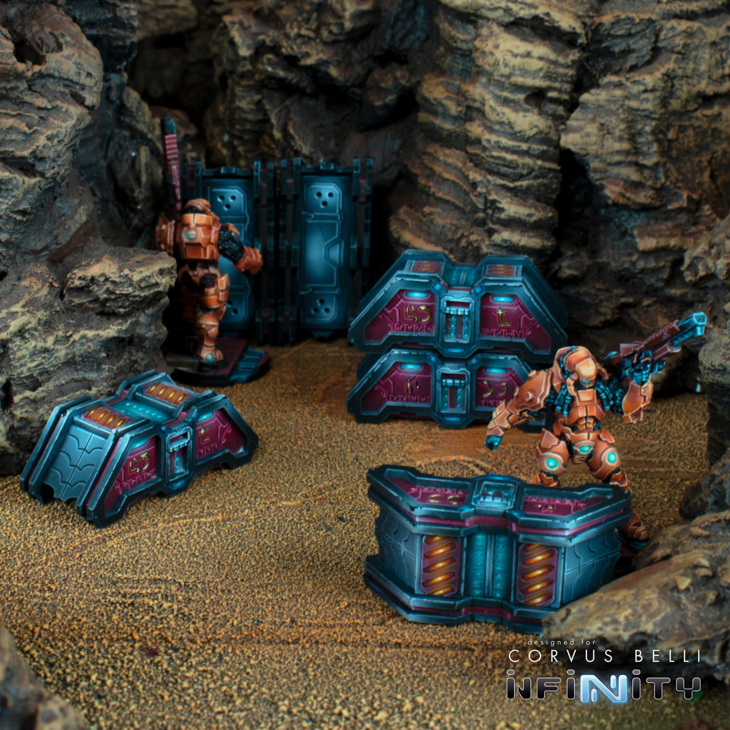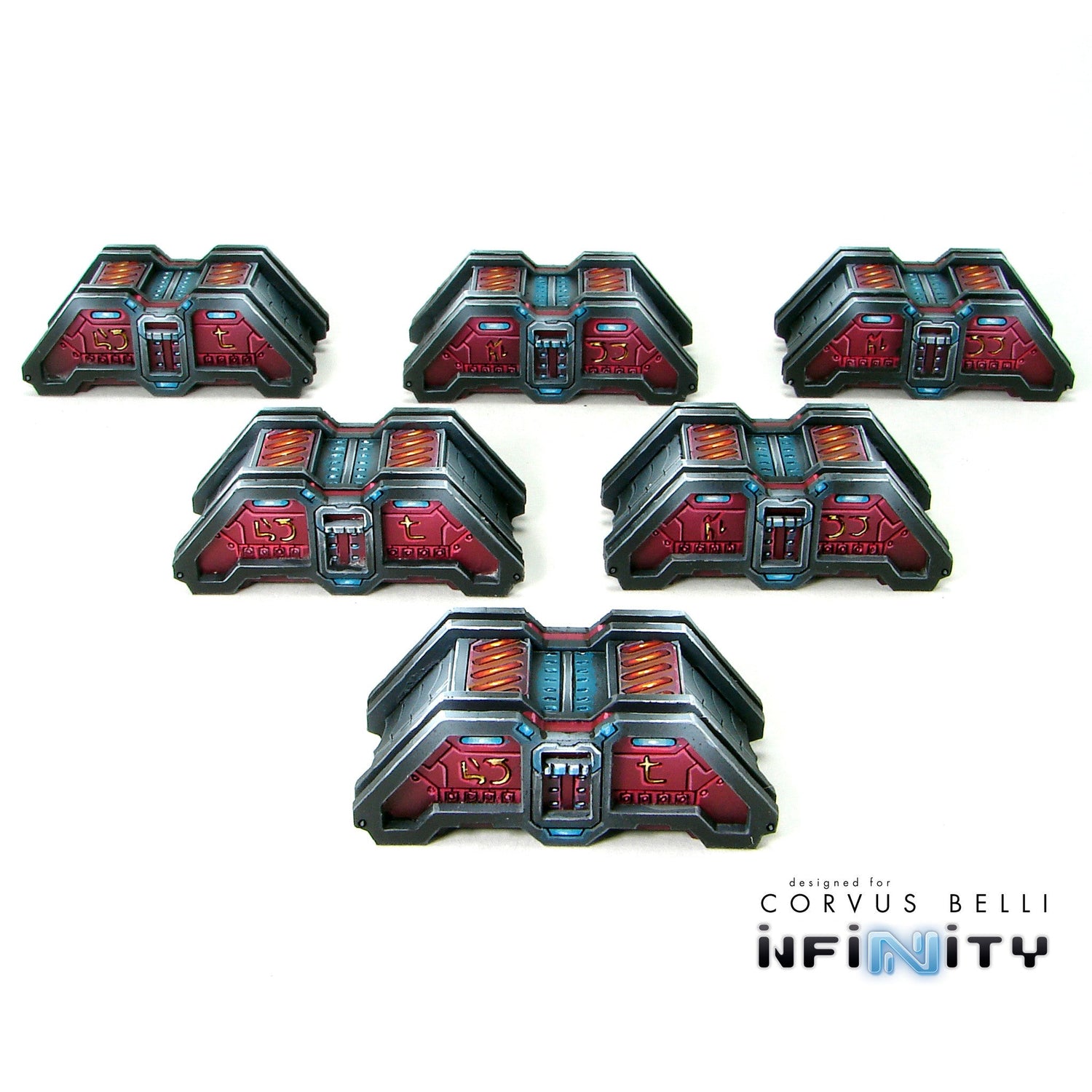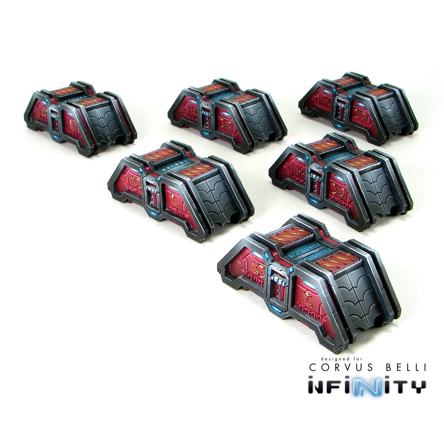 Morat Hemat Crates contain six stackable acrylic storage crates that make excellent scatter terrain for Infinity: The Game. They can be combined as lockers with our Taugak Trench System.