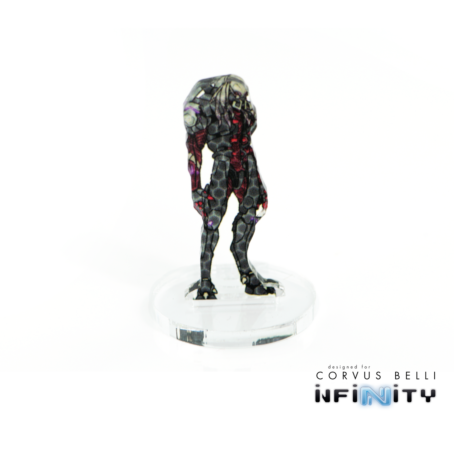 Silhouettes to represent Camouflage, Cybermask and Impersonation models in Infinity: the Game. Each is printed in full color from the original Corvus Belli Dossier Art and cut from 3mm clear acrylic, with the mimetism modifier printed on the base.