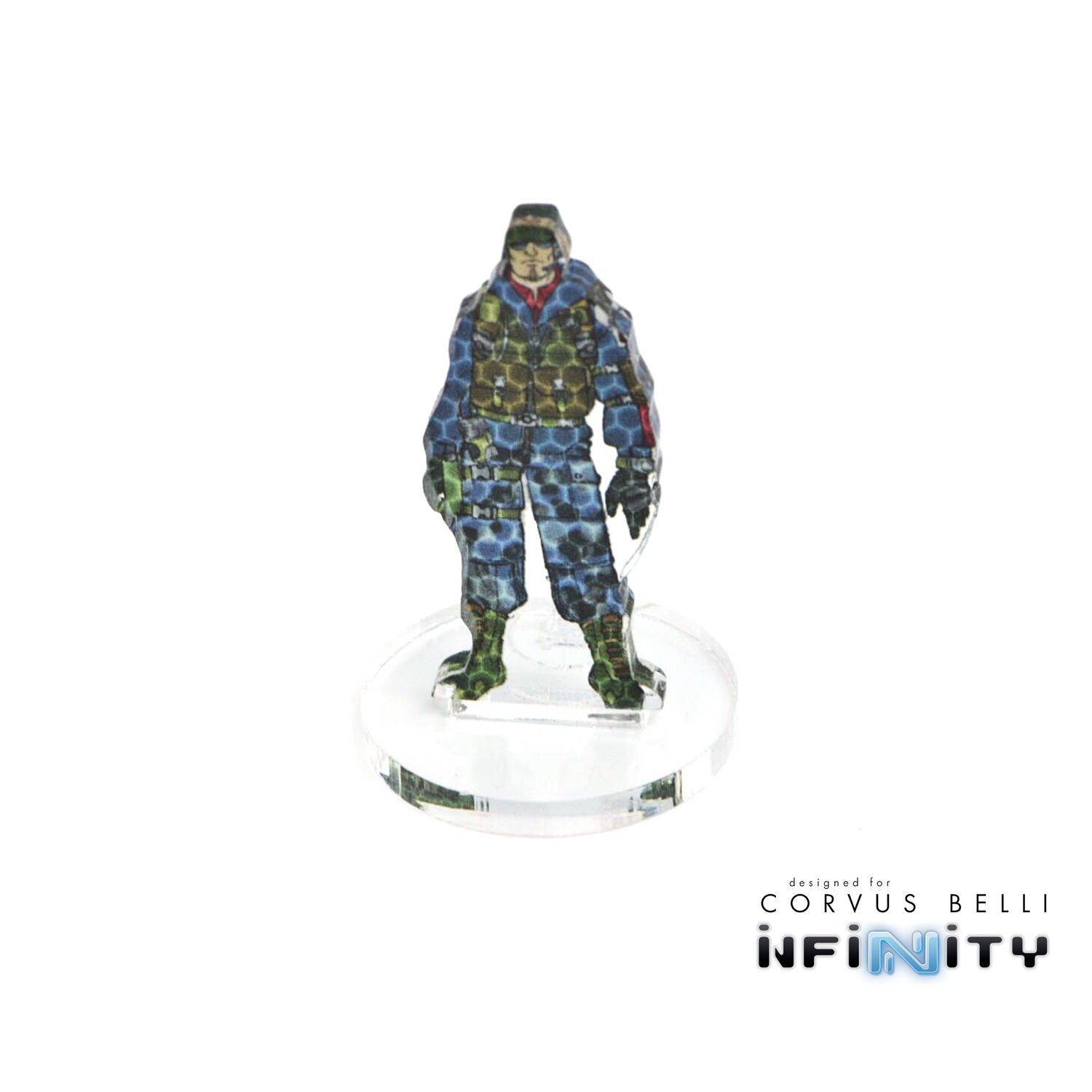Silhouettes to represent Camouflage, Cybermask and Impersonation models in Infinity: the Game. Each is printed in full color from the original Corvus Belli Dossier Art and cut from 3mm clear acrylic, with the mimetism modifier printed on the base.