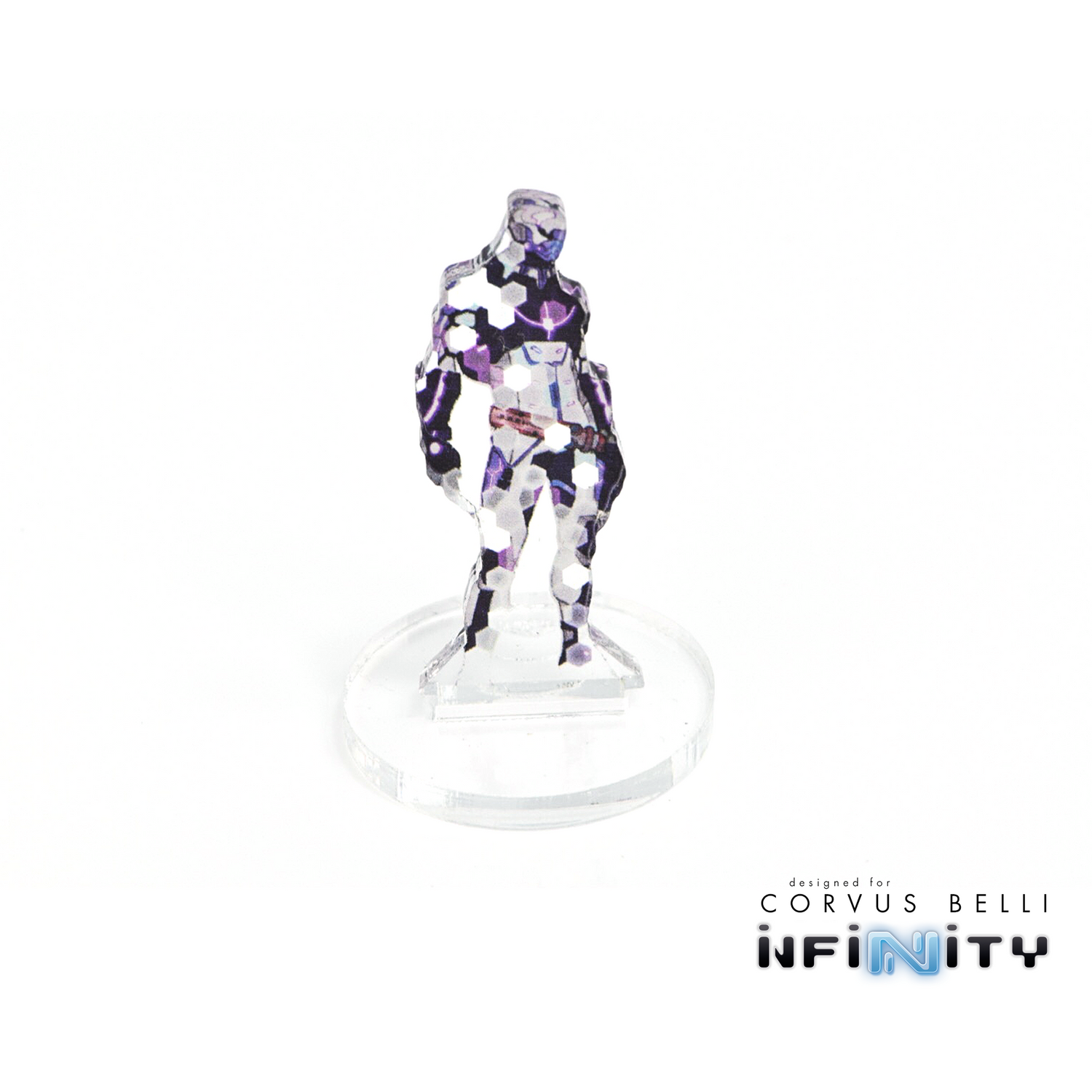 Silhouettes to represent Camouflage, Cybermask and Impersonation models in Infinity: the Game. Each is printed in full color from the original Corvus Belli Dossier Art and cut from 3mm clear acrylic, with the mimetism modifier printed on the base.