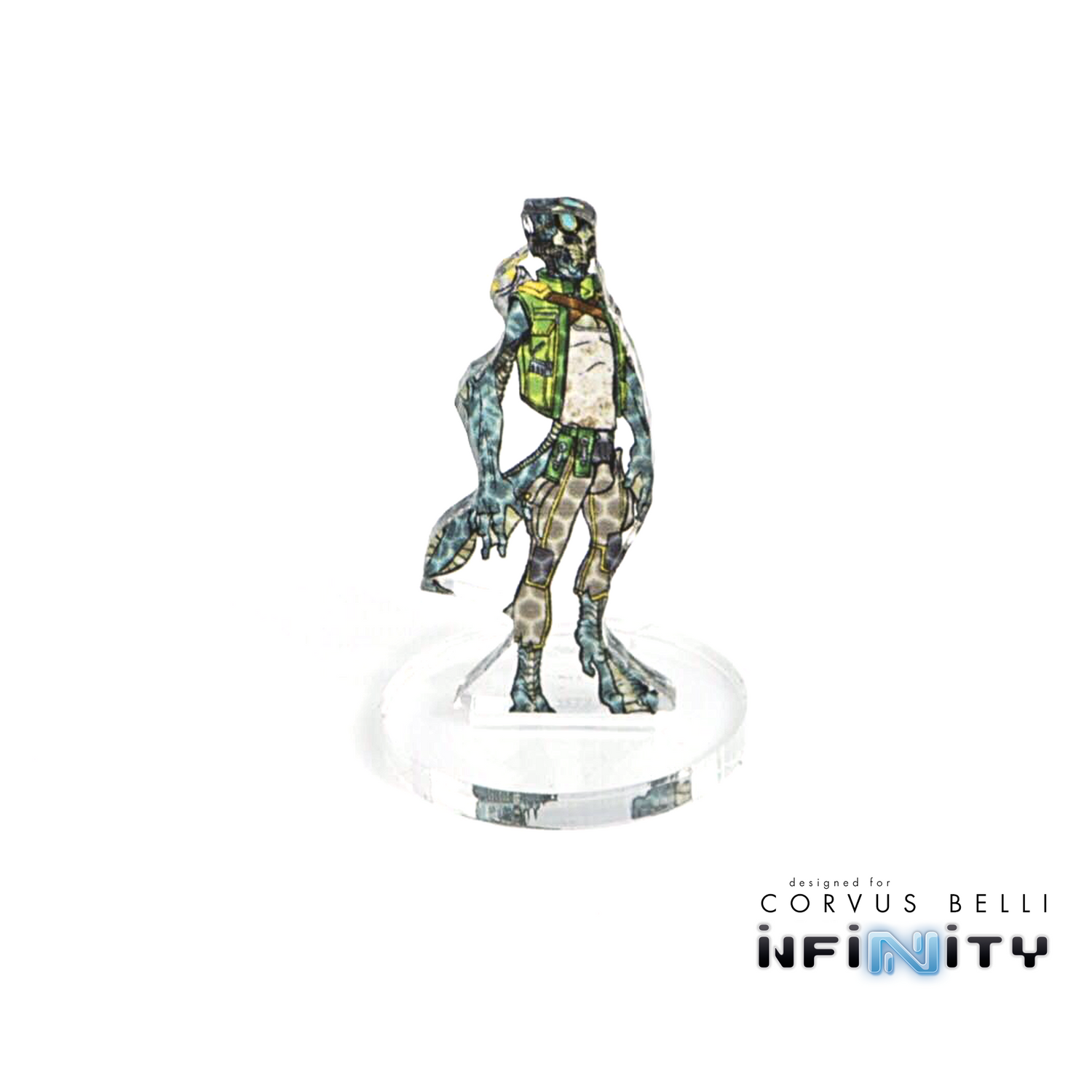 Silhouettes to represent Camouflage, Cybermask and Impersonation models in Infinity: the Game. Each is printed in full color from the original Corvus Belli Dossier Art and cut from 3mm clear acrylic, with the mimetism modifier printed on the base.