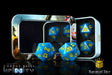 This N4, Judge & Jury, design contains a swirl of righteous blues with flecks of dark blues and inlaid with a solid yellow symbol; resin 22mm dice. The symbol is on the 1 side.