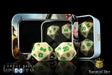 This N4, Search For Knowledge, design contains ossified bone hues swirled with veins of silk, inlaid with an elegant green symbol; resin 22mm dice. The symbol is on the 1 side.