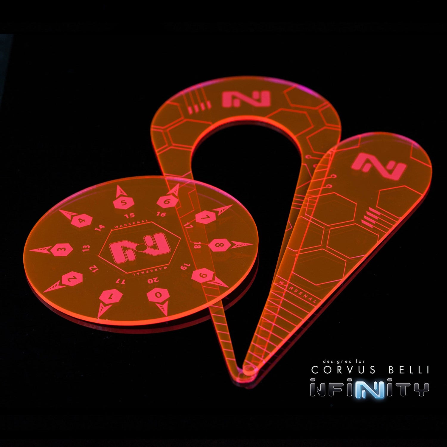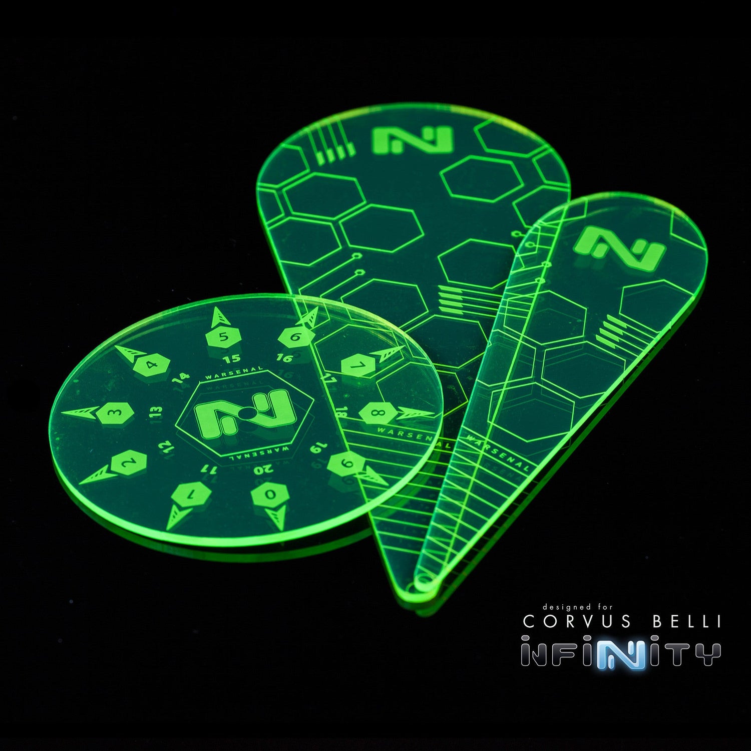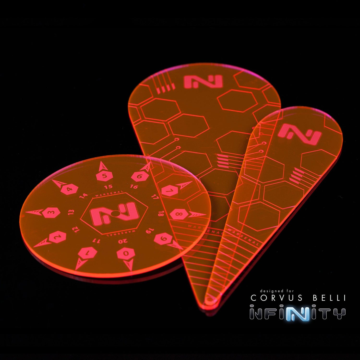 All the templates you need for Infinity: the Game crafted in lovely fluorescent acrylic.