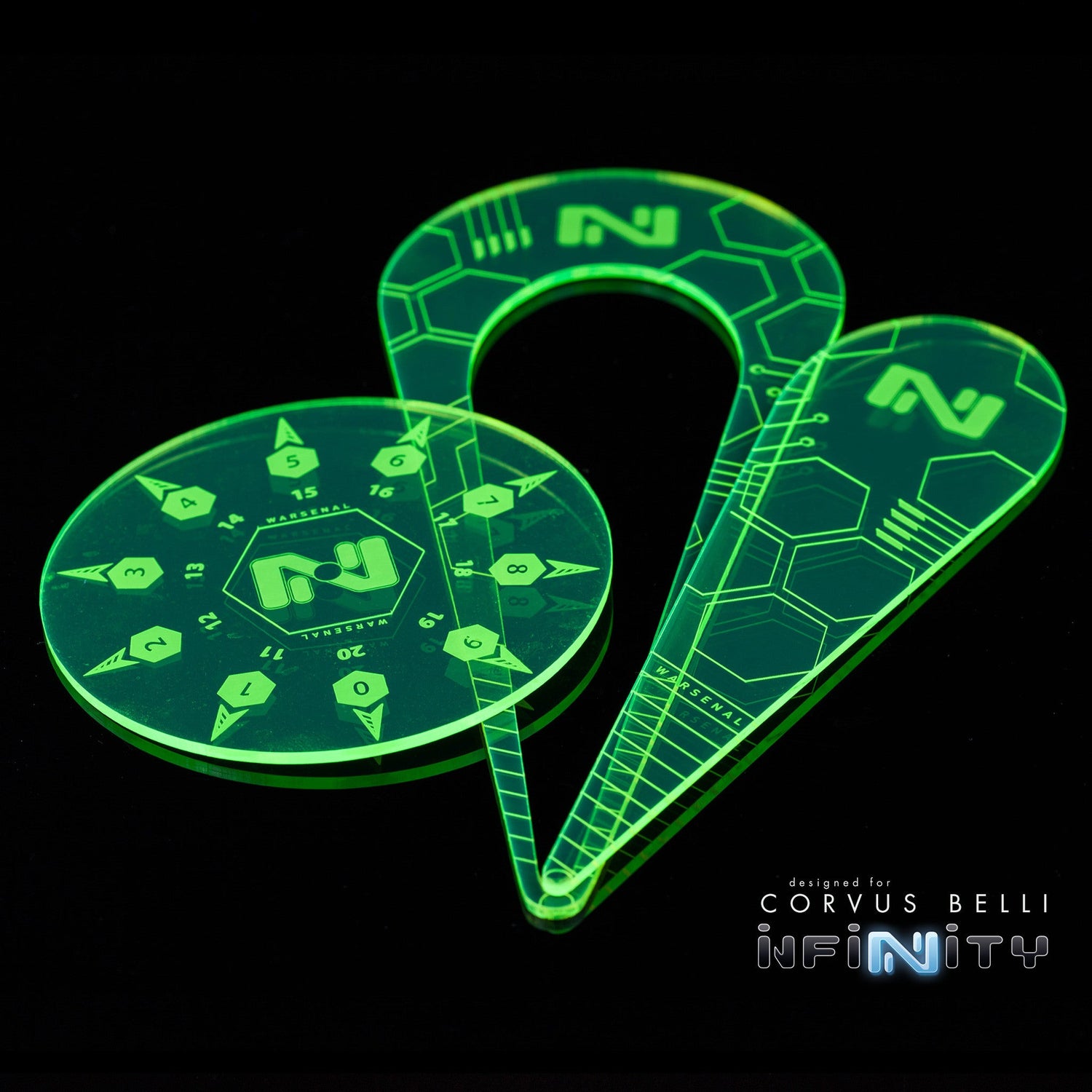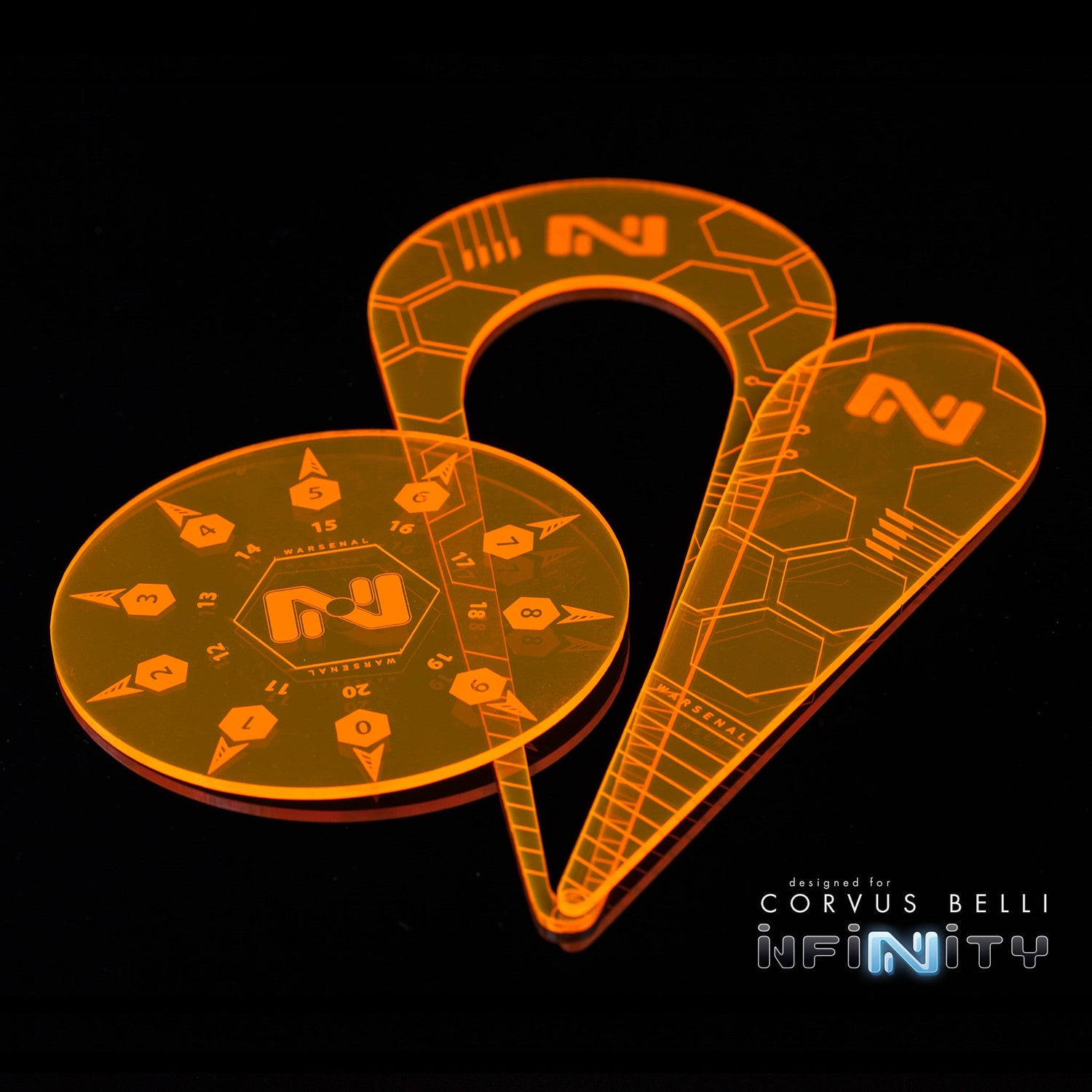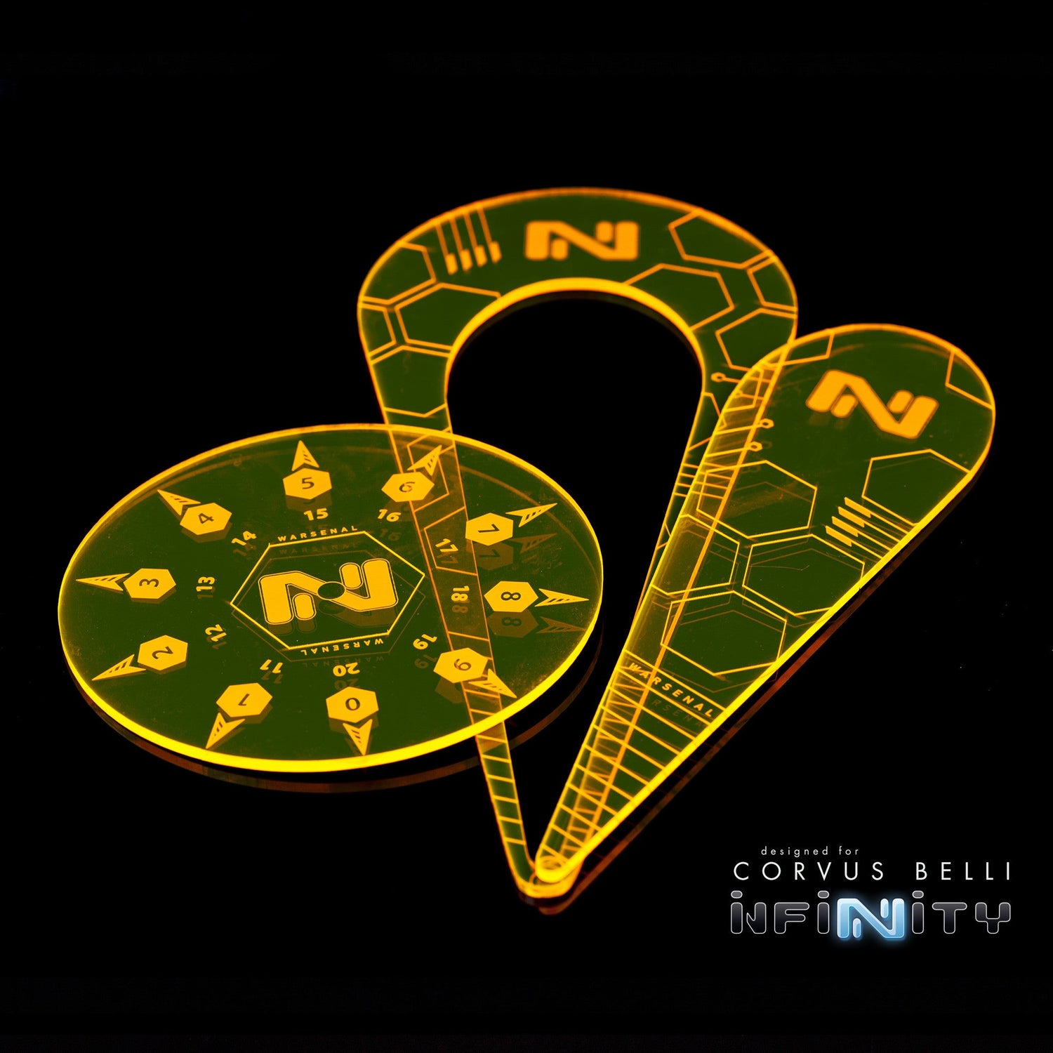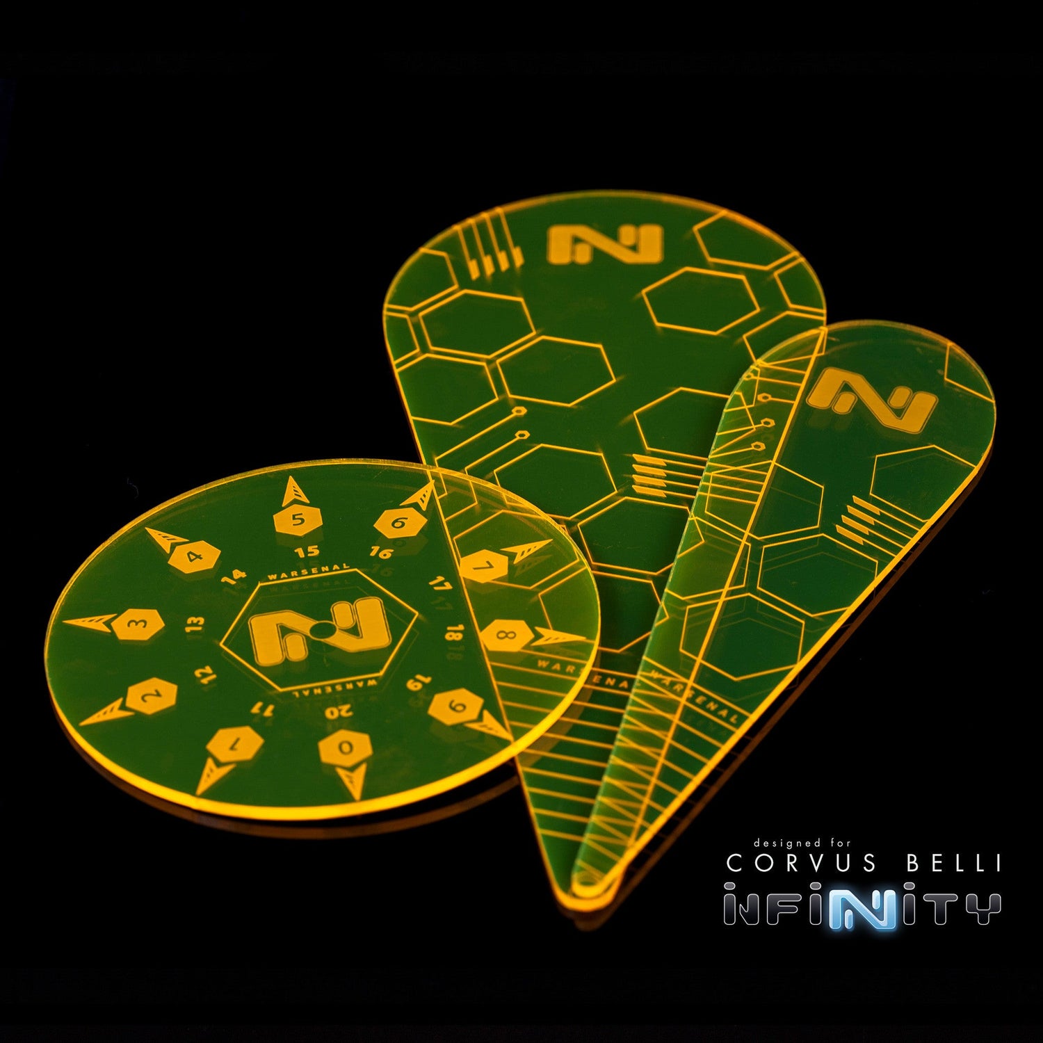 All the templates you need for Infinity: the Game crafted in lovely fluorescent acrylic.