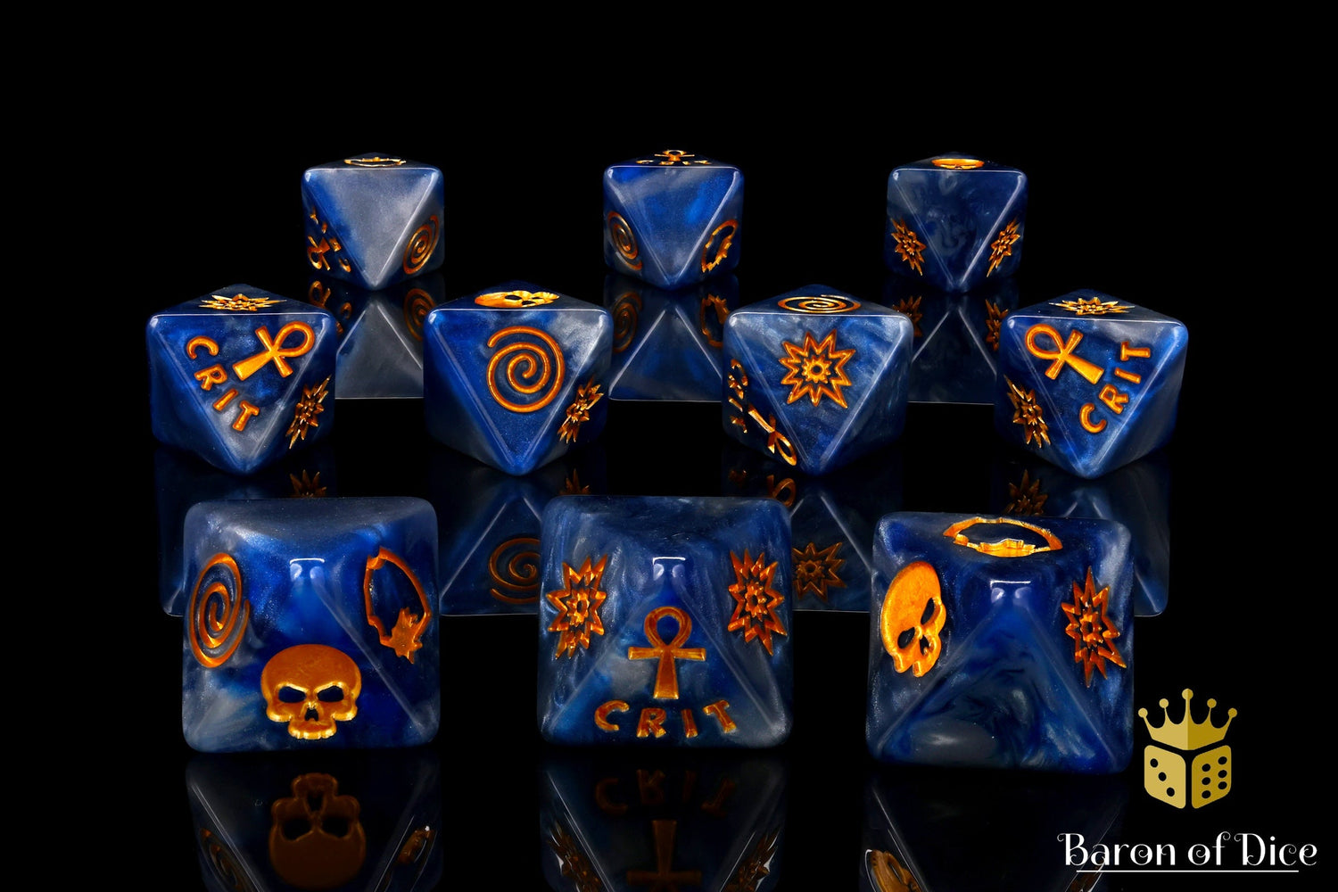 Are you ready for Judgement Day? These contain a mix of midnight blues swirled with metallic silver and inlaid with a metallic gold. The symbols are all unique with a focus on a singular critical die face differentiating the designs. Each set comes with x10 count, D8 dice encased inside an exclusive metal tin.