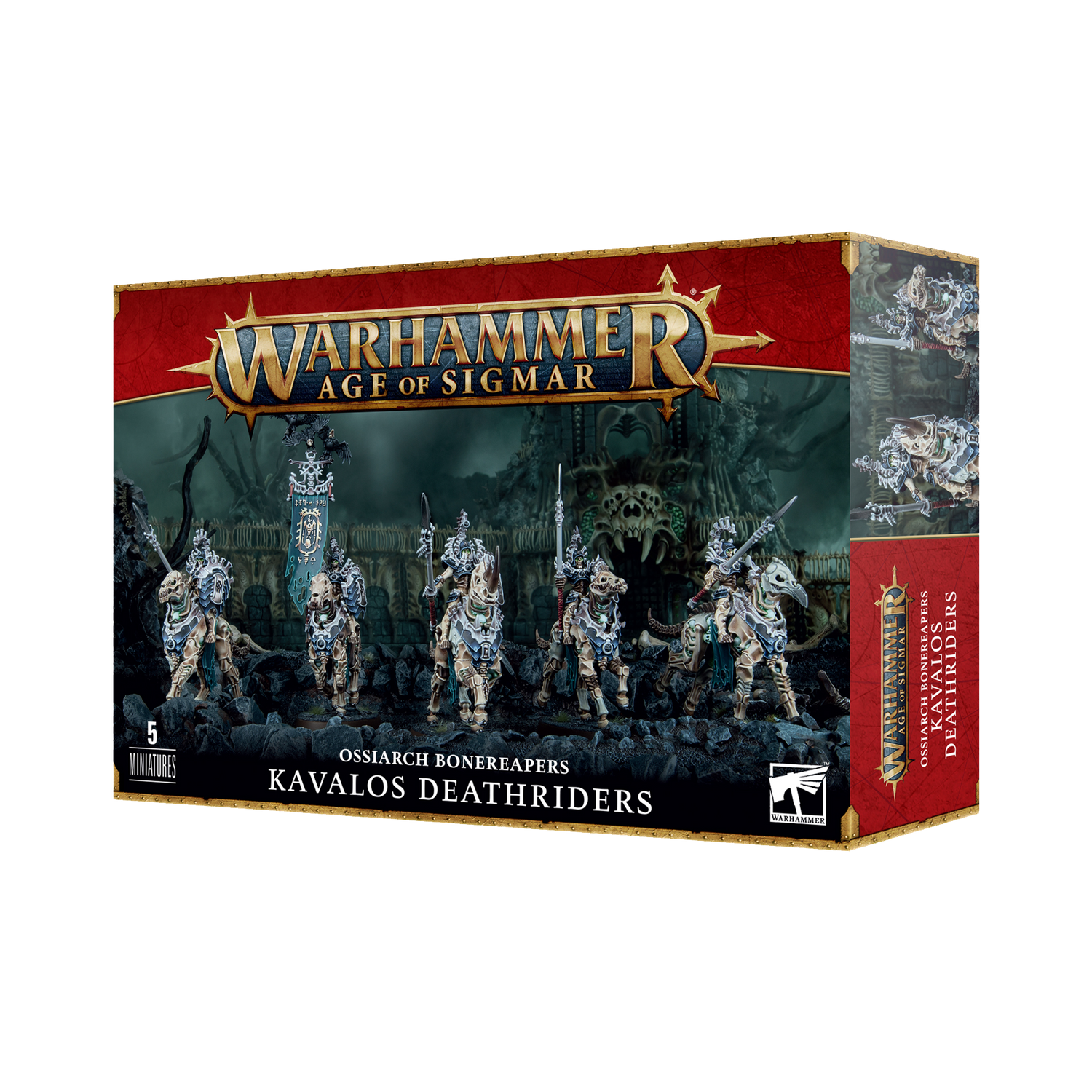 The Kavalos Deathriders can be armed with a choice of nadirite blade or nadirite spear – deadly weapons that can steal an opponent's life force. The kit also includes an option to include a Mortrek Hekatos and a Necrophoros banner bearer to lead the devastating charge.