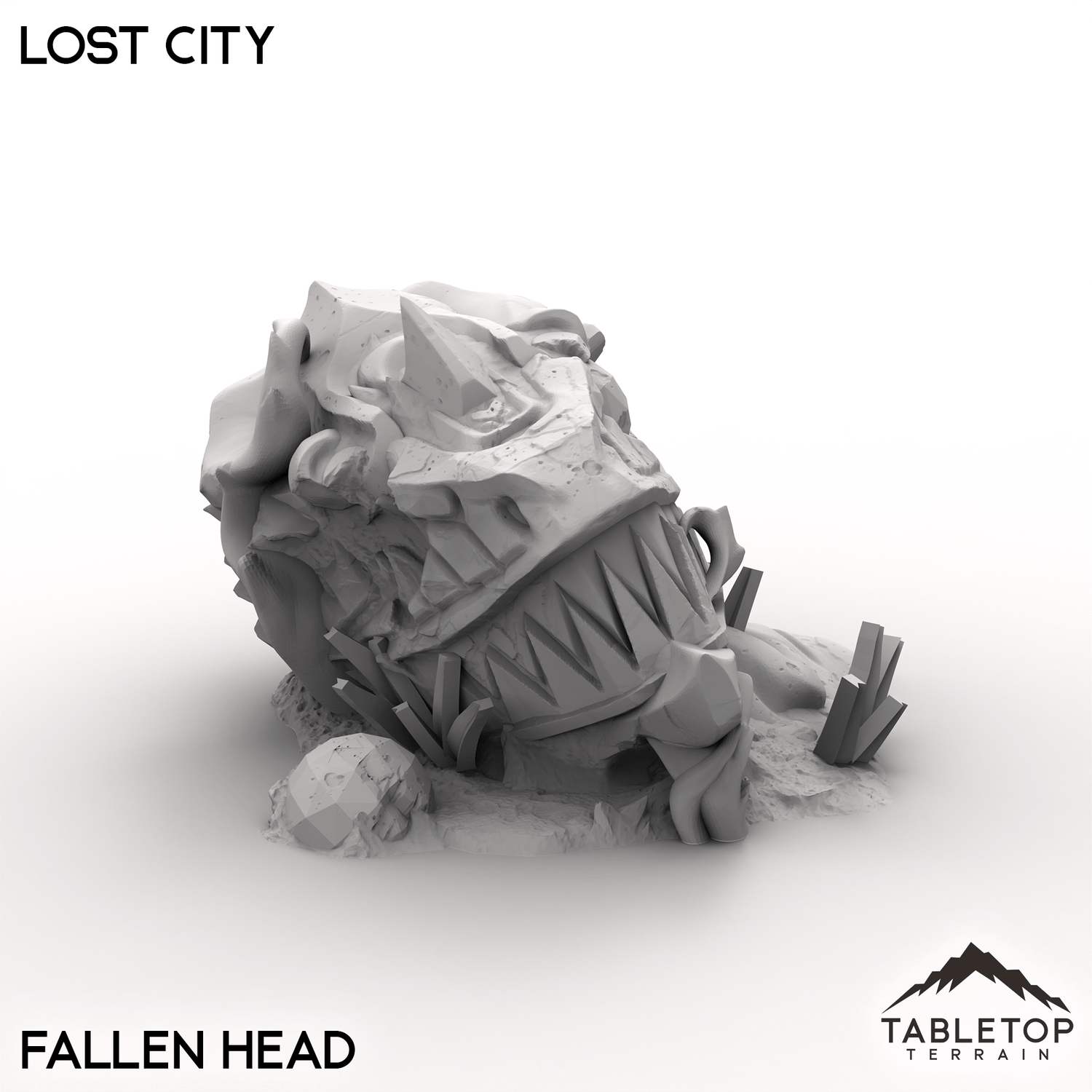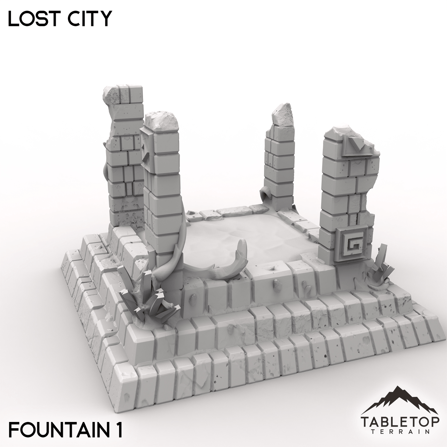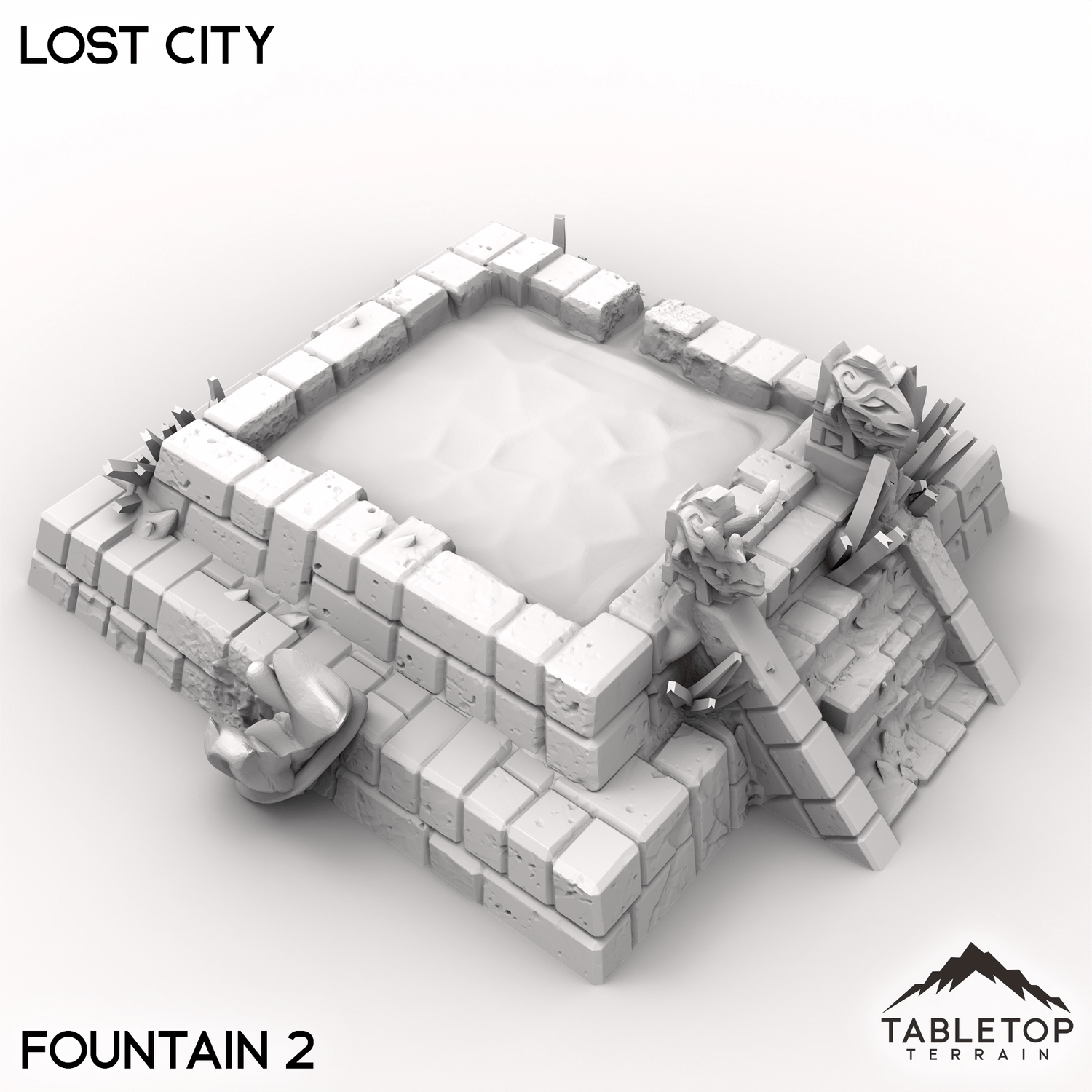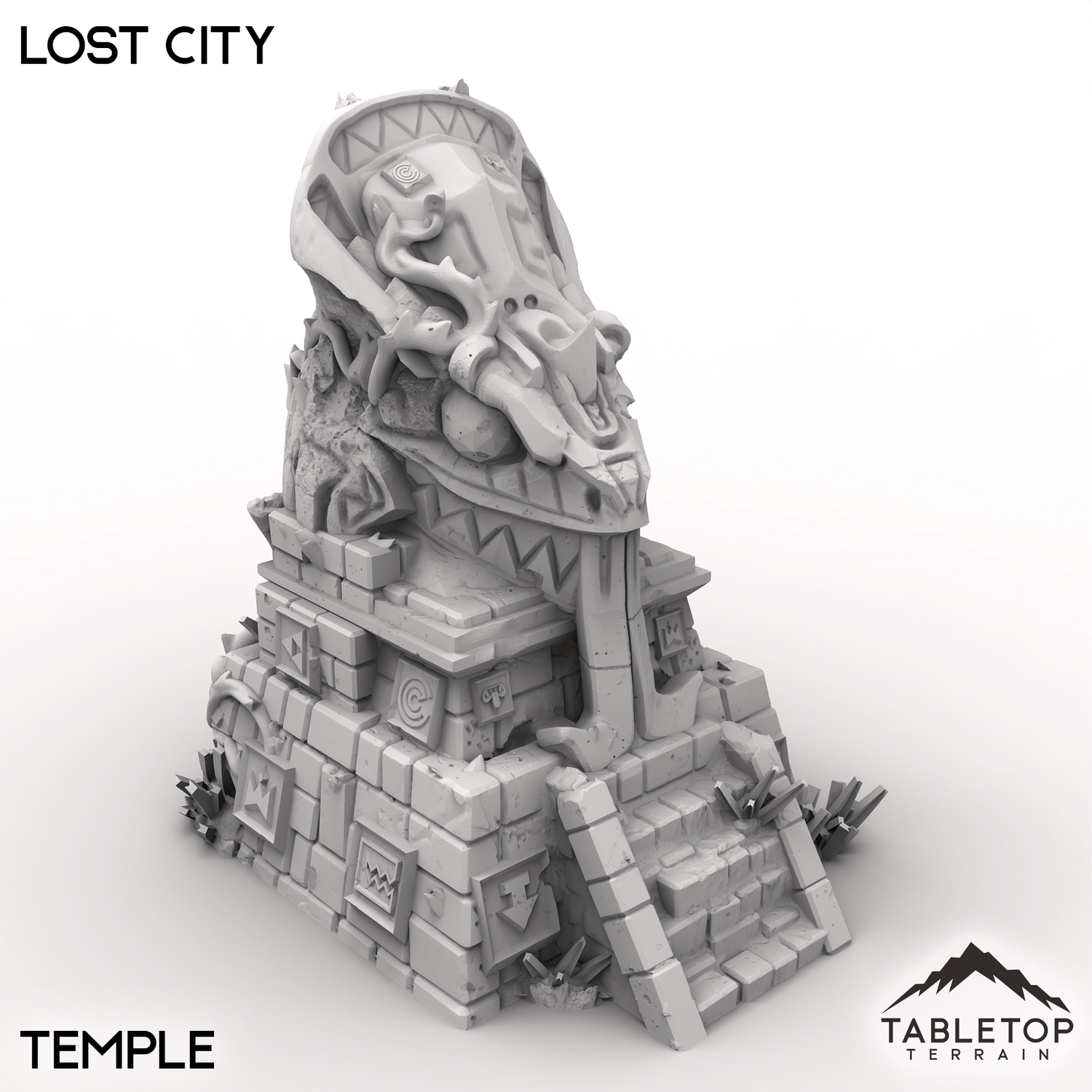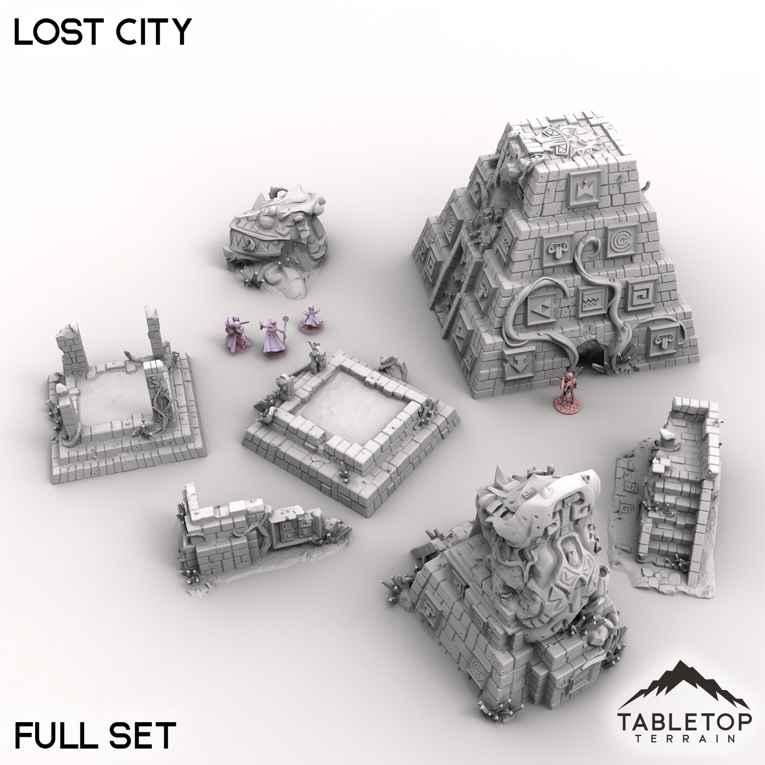 The Lost City features towering pyramids, ancient temples and crumbling ruins. Fallen stone statue heads and remains of ancient fountains add a rich sense of history to your tabletop games.