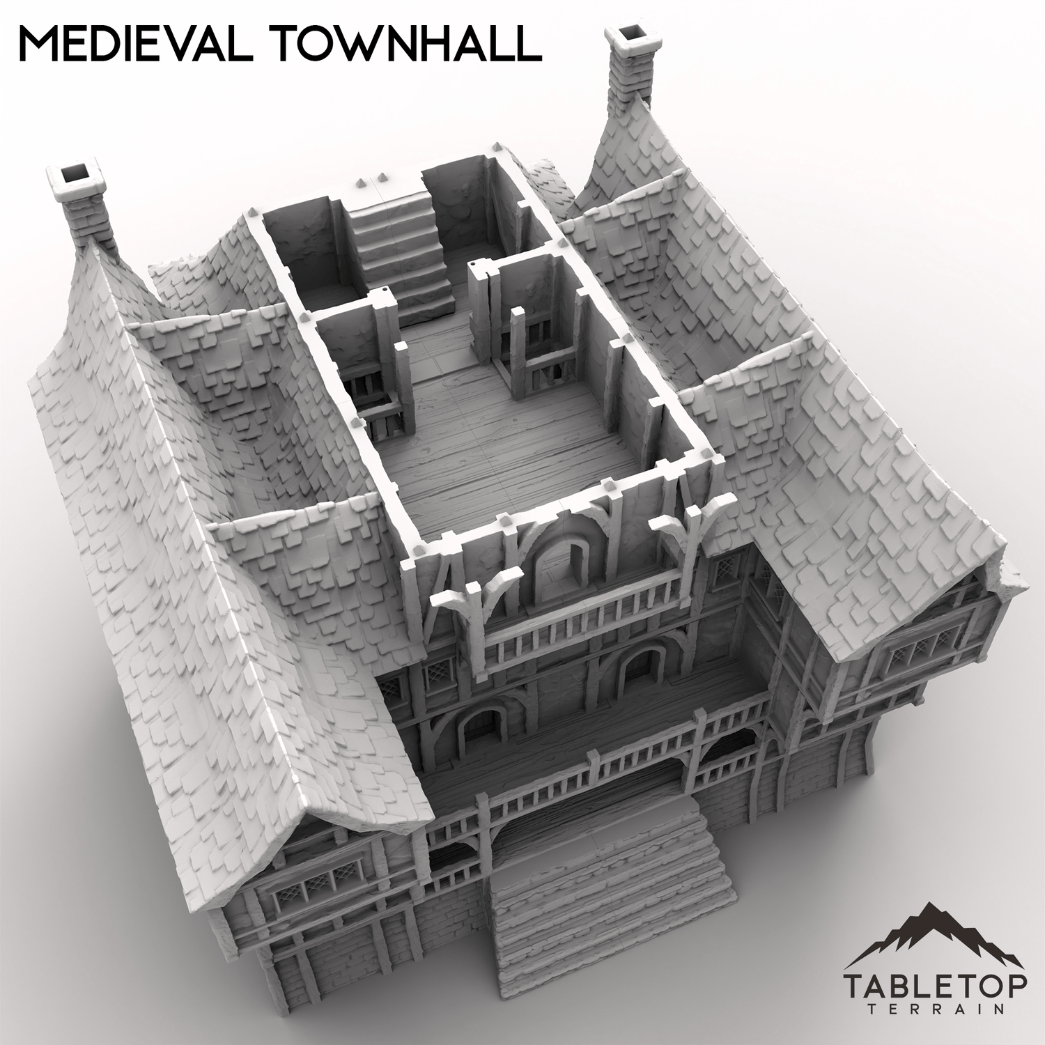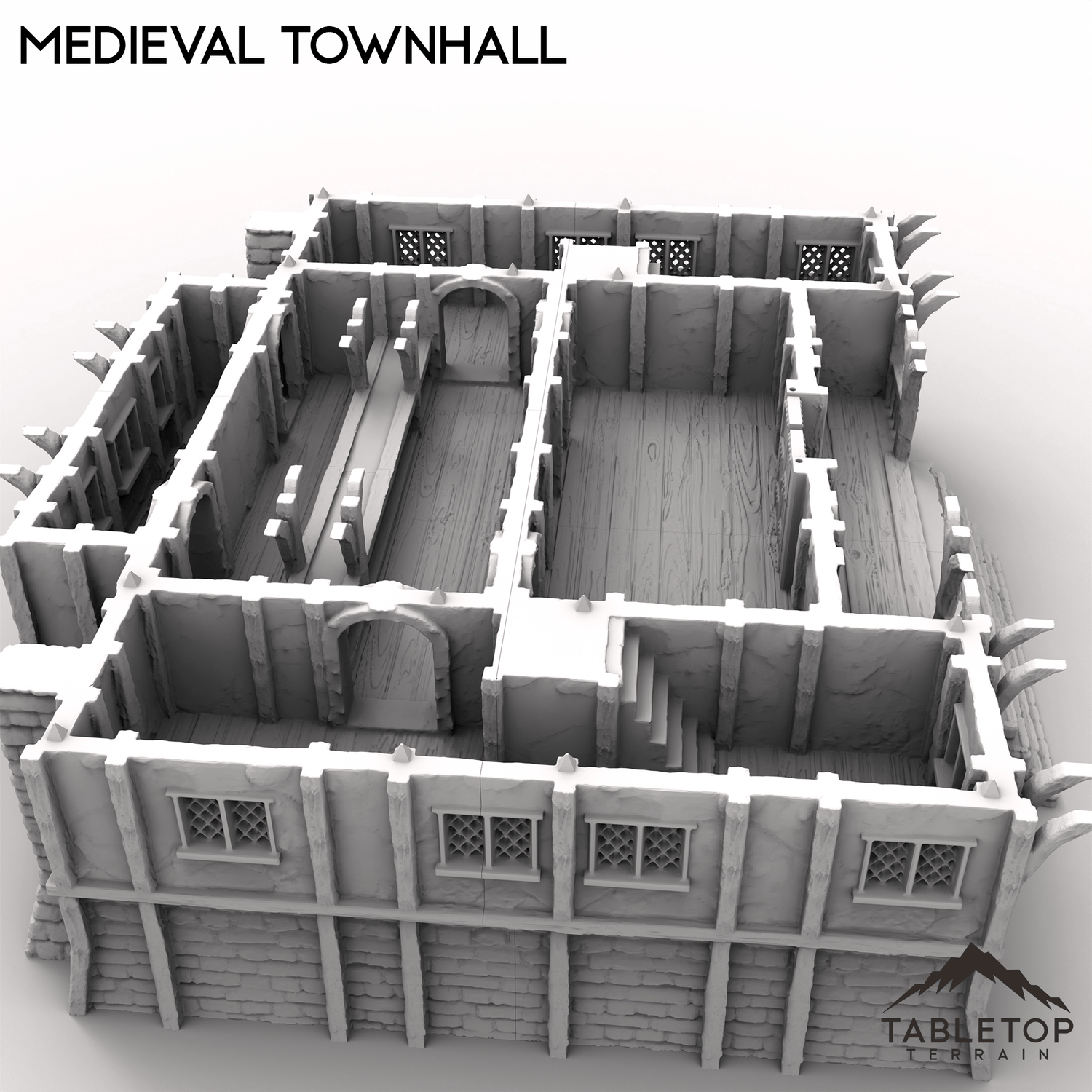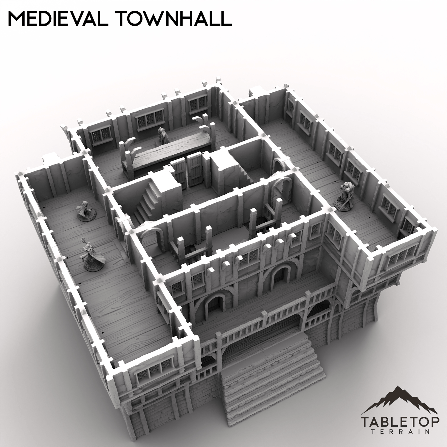 Standing at 1.5 feet tall, the Medieval Townhall is a huge 6-story building with intricate and detailed interiors made for minis. Each of the different floors has a unique design, including doorways and layouts that are all fully functional. The rooms and stairways are all set for minis at their scale, such as 28mm for most fantasy games or 38mm for most modern urban games. The building is design to be a townhall, but it would also work as a tavern or mansion with a full basement for storage.