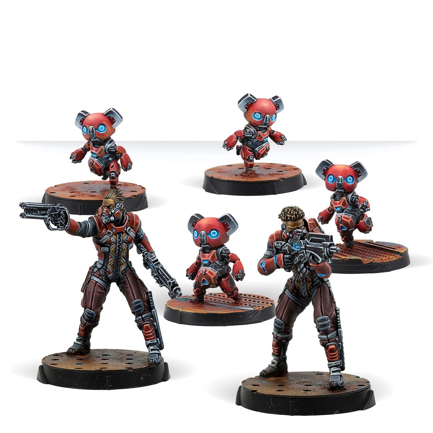 This box includes 6 miniatures: One Moran with Combi Rifle, one Moran with Boarding Shotgun, and 4 CrazyKoalas. If you are looking for powerful tabletop control, the Moran Maasai are the best choice. Their CrazyKoalas will frustrate the enemy advance and their Repeaters will extend the area of effect of your Hackers.