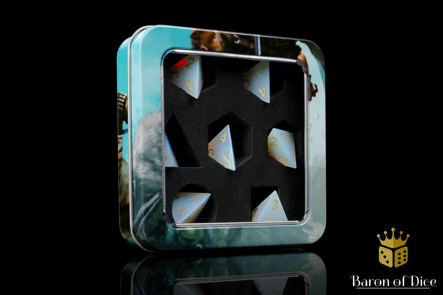 This set replicates a shrill of glass, honed to perfection and ready for rolling. Cut from the earth, using Natural Opal. Our dice are hand polished sharp corners, unique amongst our collection. Featuring a marbled blue clear, with veins of pinkish hues, these are inlaid with a metallic gold; premium gemstone 20mm dice set containing seven D4s.