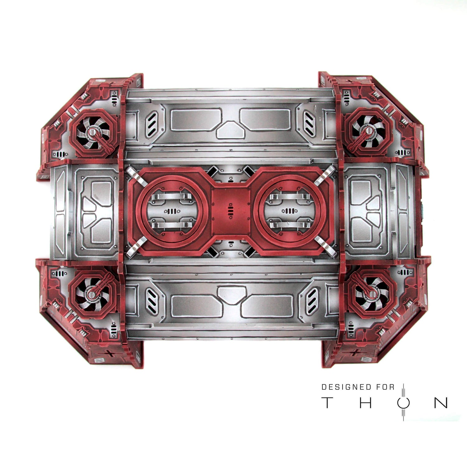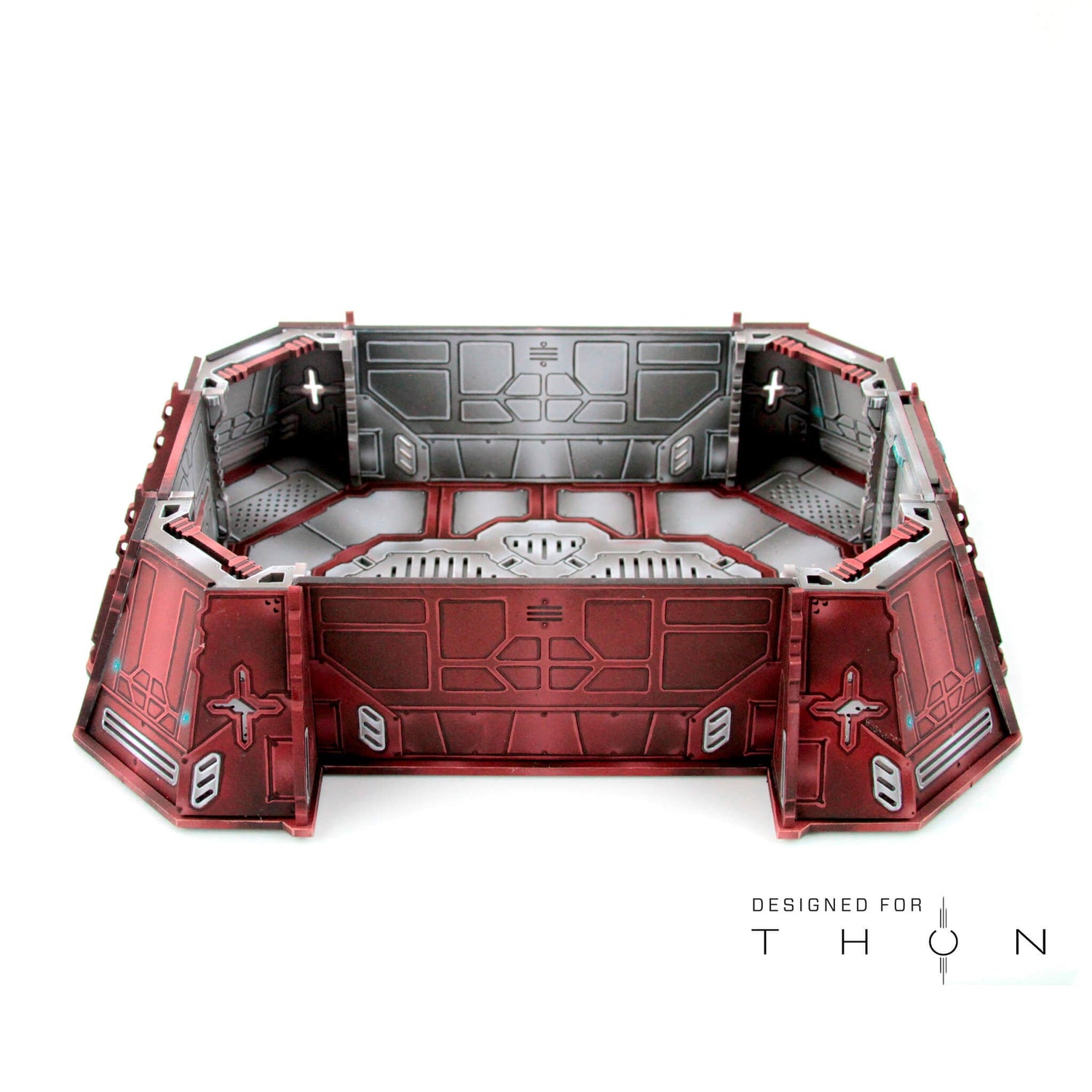 The Ord Bulkhead is a modular addition to the Thon Ord range of terrain. It includes two long walls, one narrow wall and one door, all of which are removable and interchangeable with other components of the Thon Ord line. The roof is included. An optional inlay for the floor allows you to place two 40mm objectives, or use the included hatches to fill the holes.