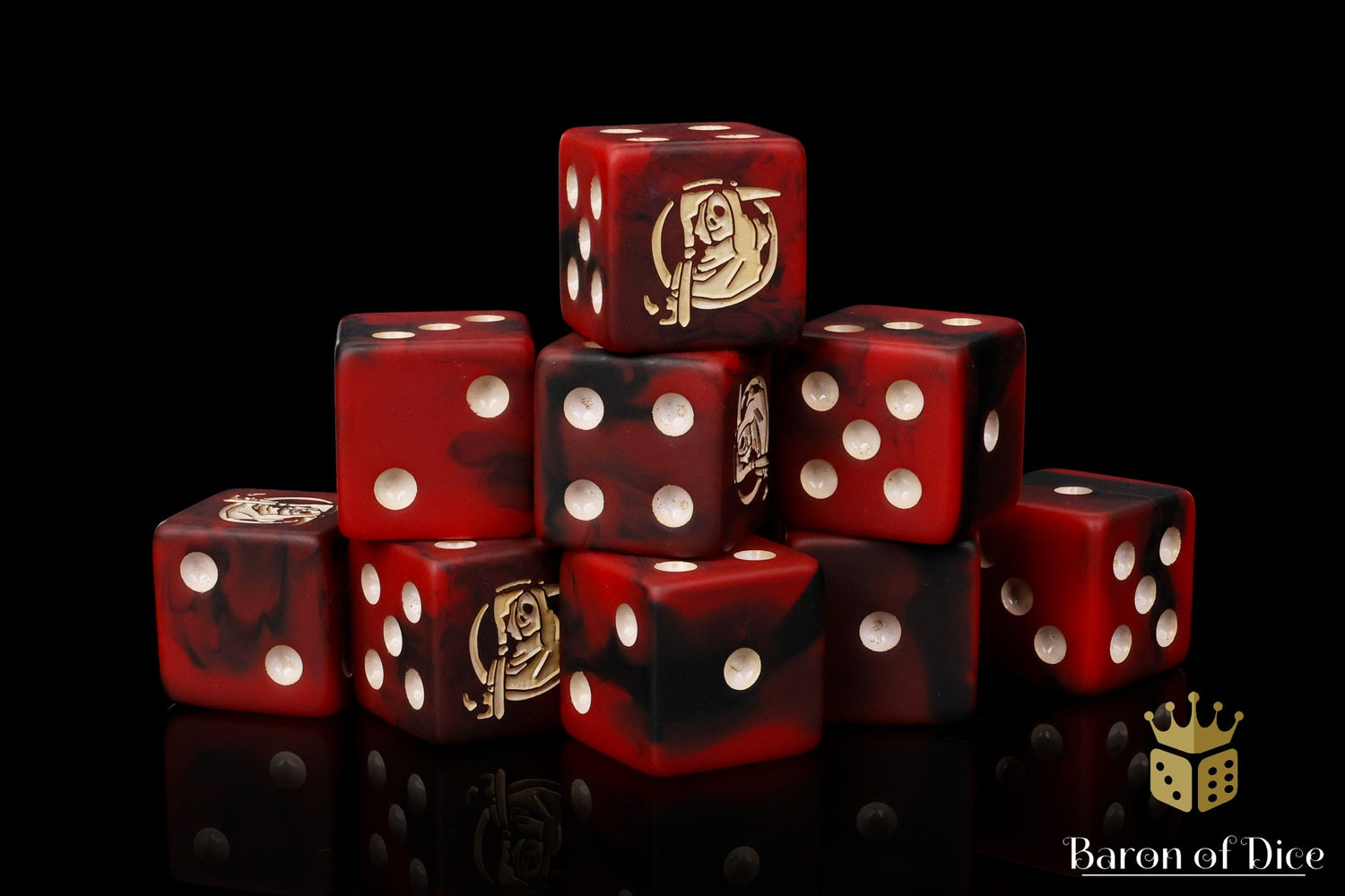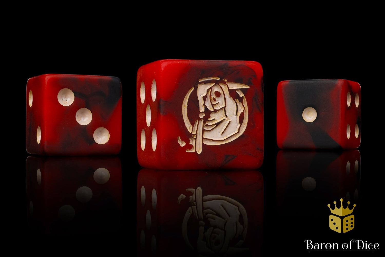 Featuring the Red Bluff Battle Reports infamous Grim Reaper, support your favorite channel and rock a sick design! These contain rich bloody red pools swirled with black magic and inlaid with a bone marrow color; hand mixed resin 16mm dice. The symbols are on the 6 side. Our premium dice come in a unique reusable metal tin.