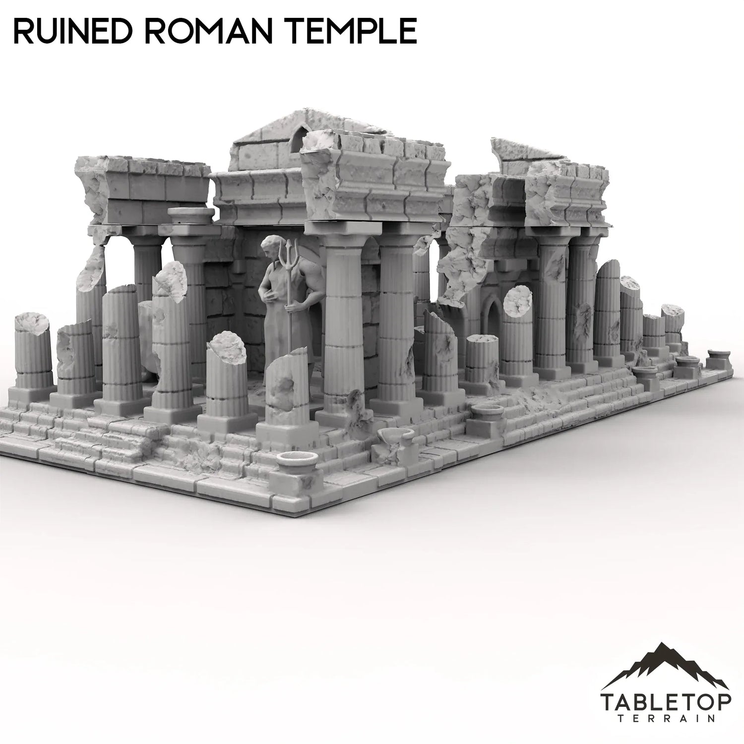 The Ruined Roman Temple stands with tall, broken columns rising from a cracked marble floor, their tops missing or leaning precariously. Sections of the once-grand roof have collapsed, leaving jagged edges framing the open sky. Fallen statues and shattered tiles litter the ground, providing both cover and difficult terrain for skirmishes.