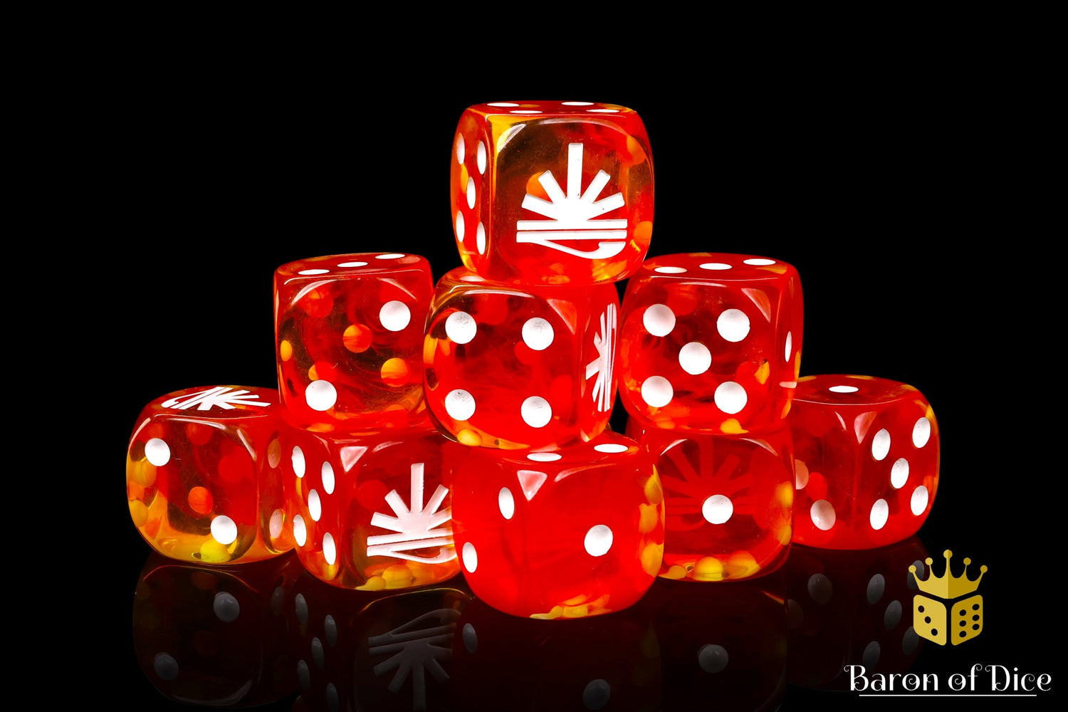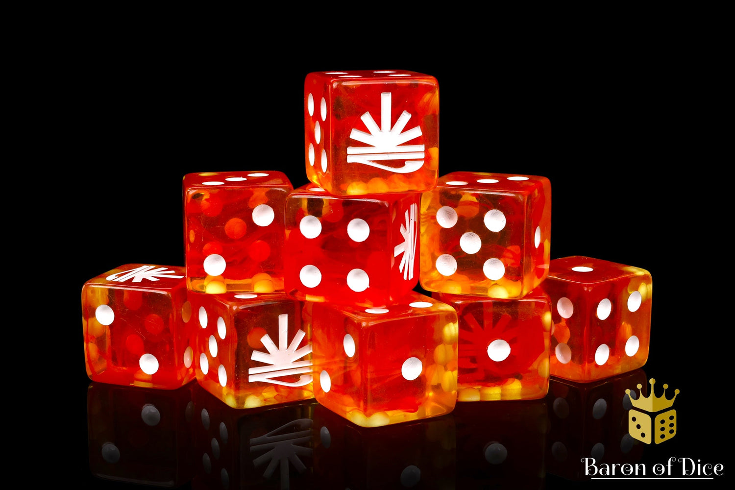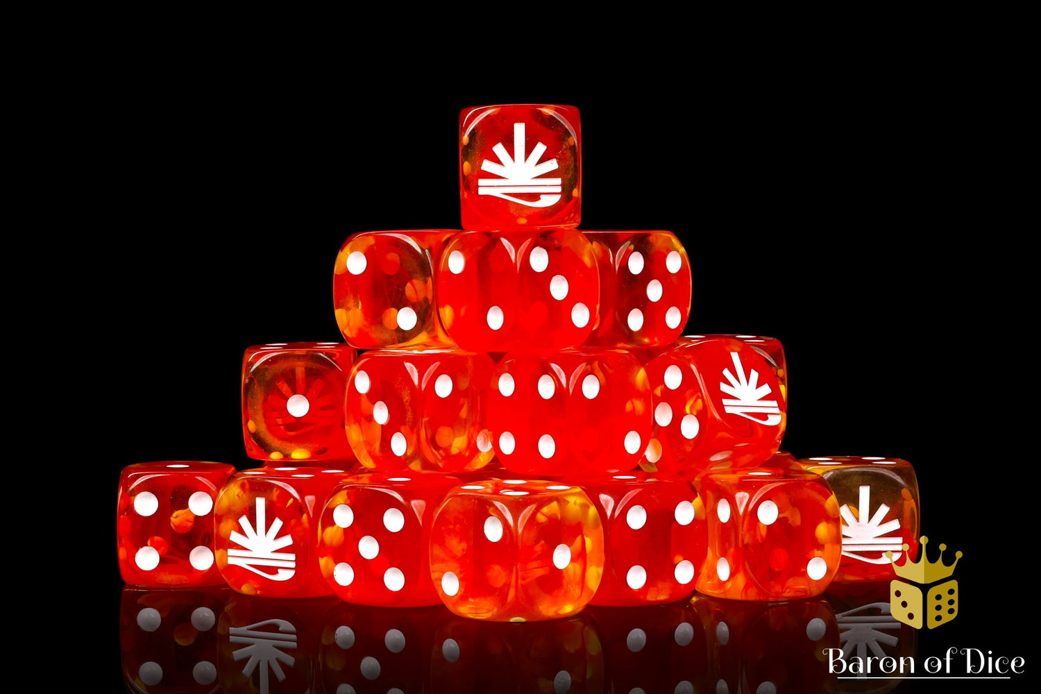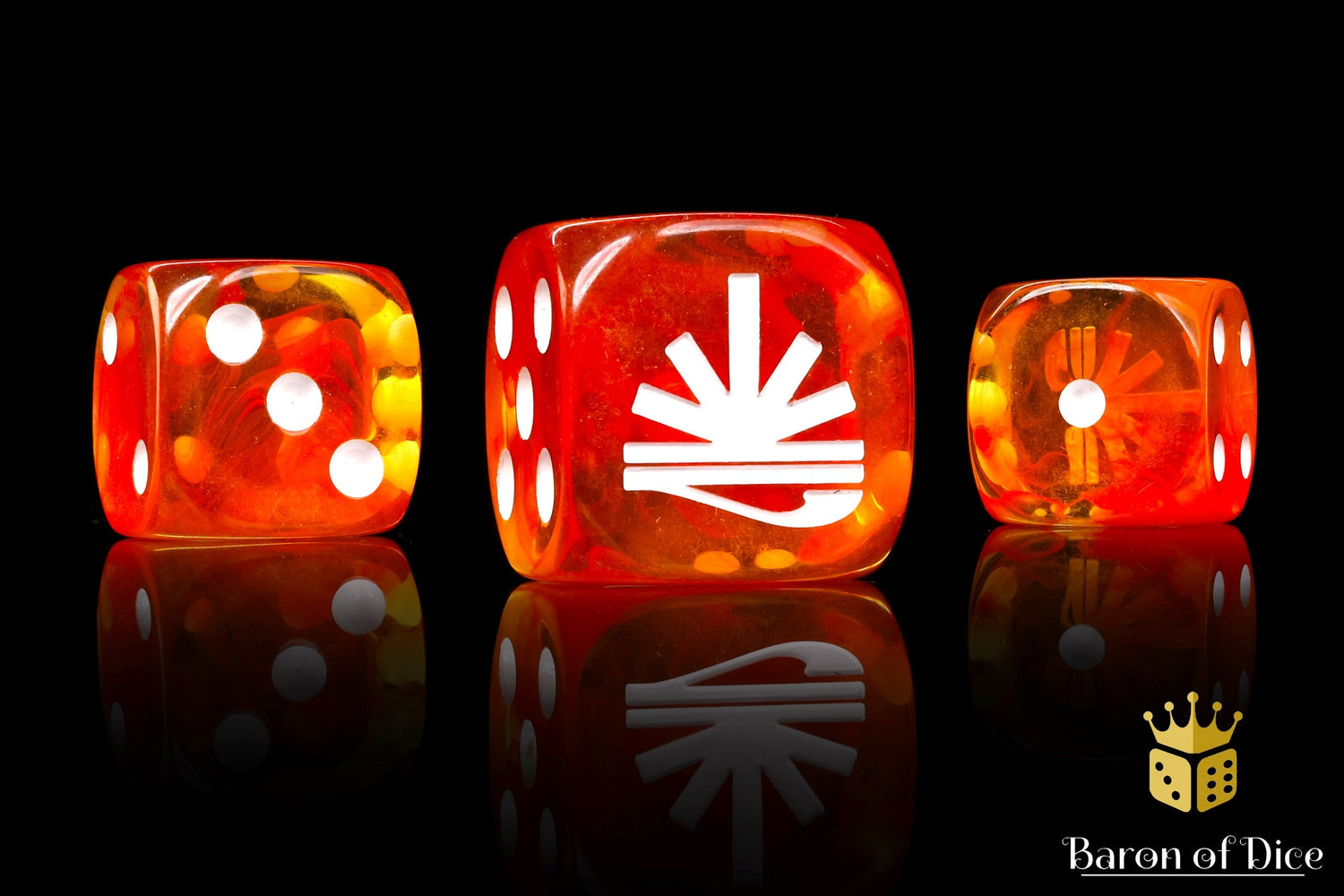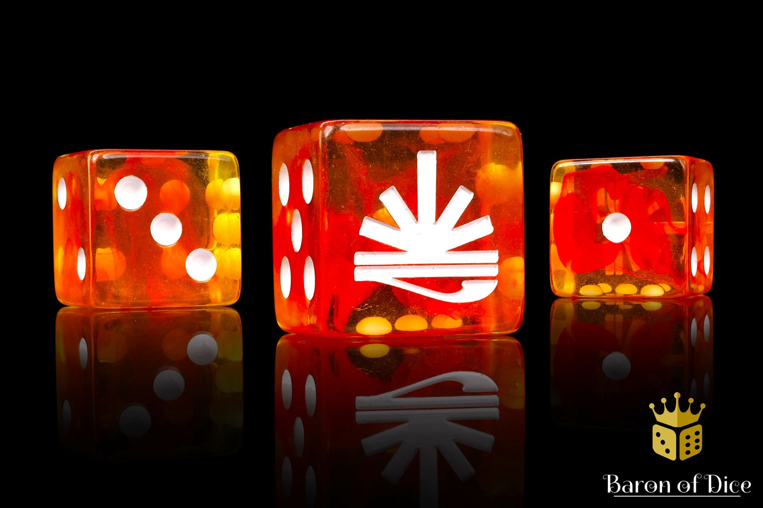 Black Sun has descended! These contain a translucent mixture of sunsetting oranges swirled with bright yellows and inlaid with a crisp white; hand mixed resin 16mm dice. The symbols are on the 6 side. These dice come in round corner or square corner; choose wisely! All of our premium dice sets come with unique reusable tins.