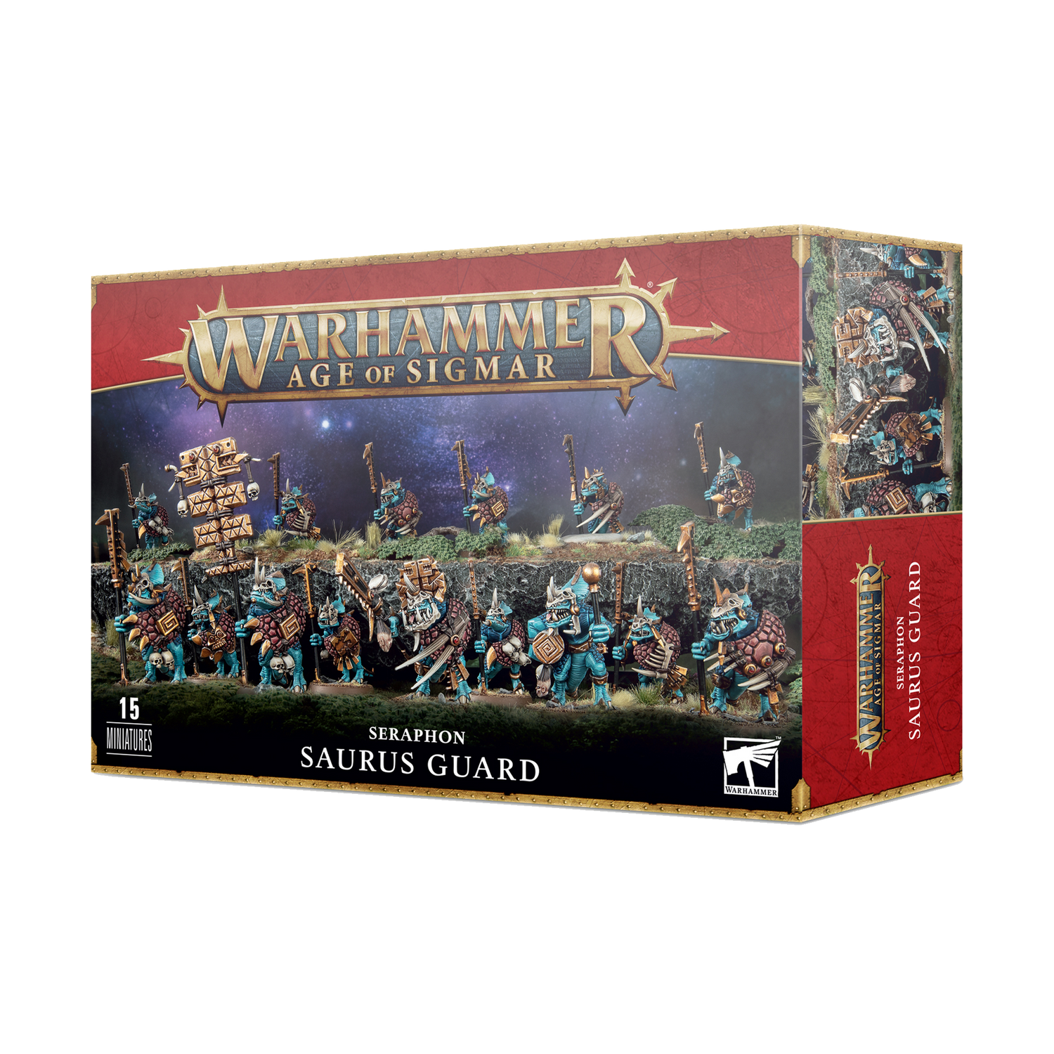 This multipart plastic kit builds 15 Saurus Guard – dedicated defenders of the Seraphon leadership. These elite warriors wield spiked celestite polearms, clad in ornate armour to supplement their natural scaly skin. The kit includes loads of options to personalise your Saurus Guard – all of the bodies, legs, polearms, and shields are interchangeable, with nine different head designs you can use on any Guard, and plenty of jaw-guard accessories. The kit also includes parts to build a Saurus Guard Alpha champion with a unique polearm, shield, and headdress, a War-drummer musician, and an Icon Bearer with a choice of three banner tops.