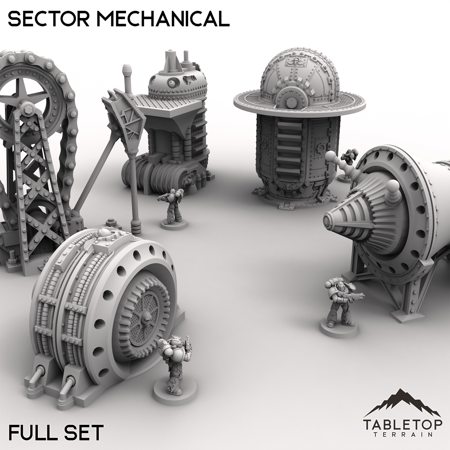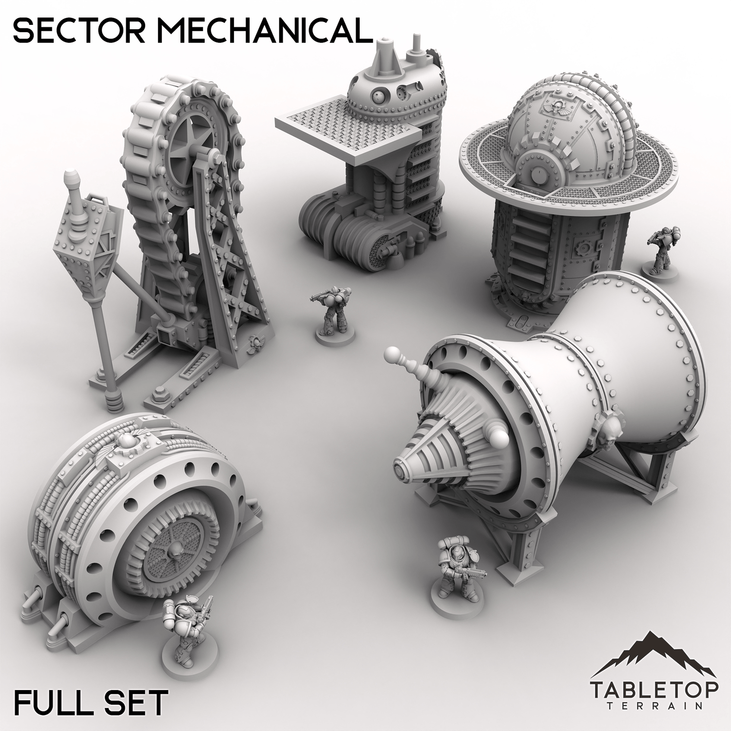 Sector Mechanical is a set of 5 different pieces of heavy machinery. The equipment is designed to look as if it is made from think metal plating, with large rivets and crossbeams. Each piece can be bought separately as-needed, or all together for a built-in discount.