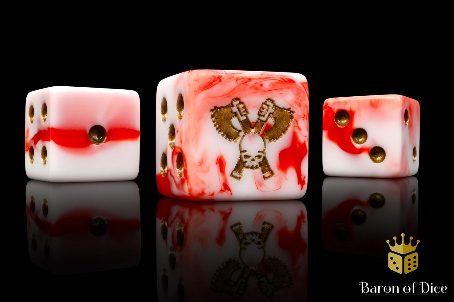 These contain a base of noble whites swirled with dark, dried, bloody hues and inlaid with a rusted brass; resin 16mm dice. The symbols are on the 6 side. These dice have an option of round or square corner, choose wisely! Our premium dice now come in a unique reusable tin. Consider the 8 count for Blessing of Blood rolls!