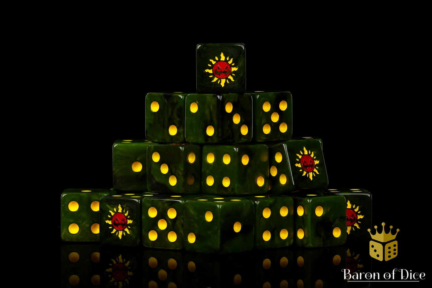 These contain a mixture of with hulking orc greens swirled with Da Boss green and inlaid with a two-toned sneaky yellow and bloody red; resin 16mm dice. The symbols are on the 6 side. These dice have an option of round or square corner, choose wisely! Our premium dice come in a unique reusable tin!